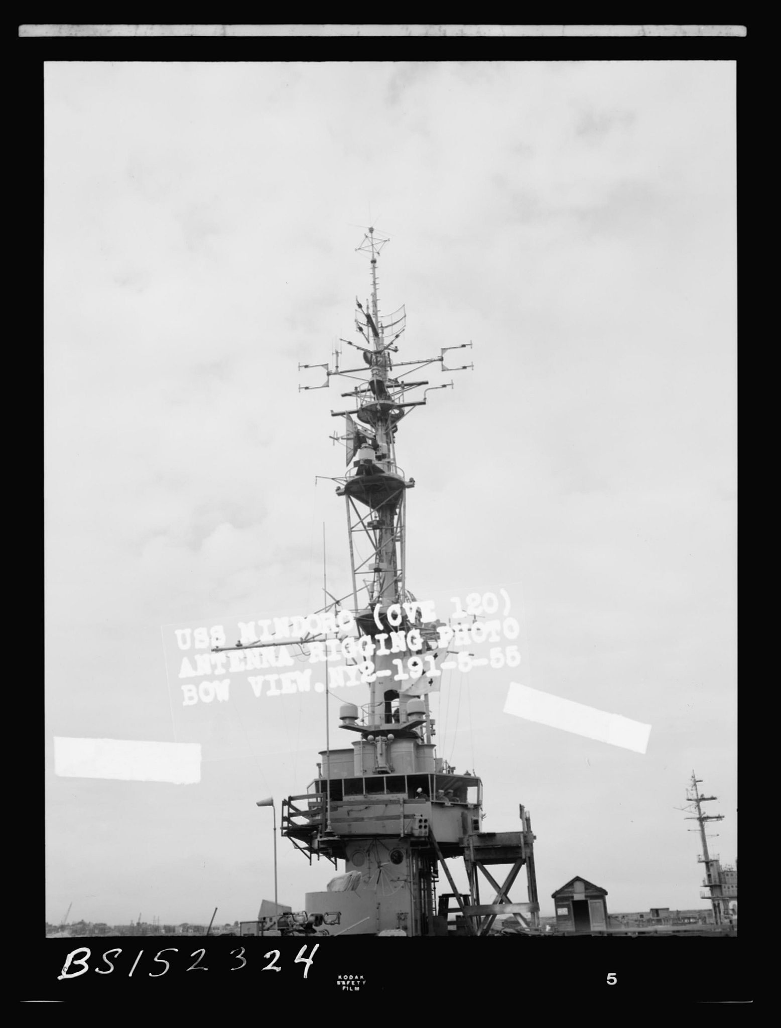 145k | USS Mindoro (CVE-120), antenna rigging photo bow view, May 1955. Boston Naval Shipyard, # NY2-191-5-55. National Archives and Records Administration (NARA), National Archives Identifier: 24741467, Local ID: 19-NN - CVE-120 Mindoro - 152324. |