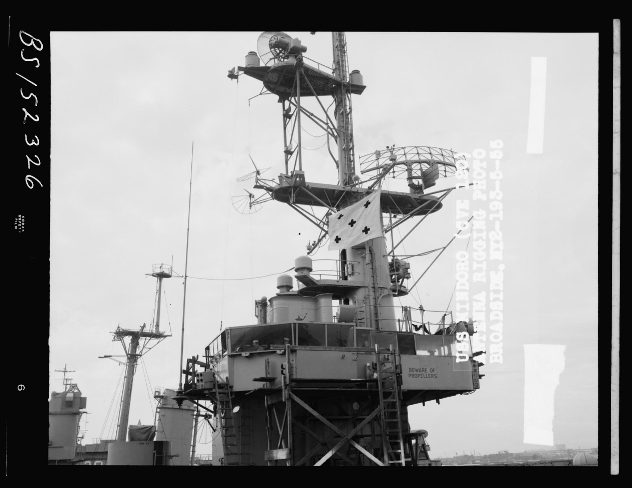 209k | USS Mindoro (CVE-120), antenna rigging photo broadside, May 1955. Boston Naval Shipyard, # NY2-193-5-55. National Archives and Records Administration (NARA), National Archives Identifier: 24741471, Local ID: 19-NN - CVE-120 Mindoro - 152326. |