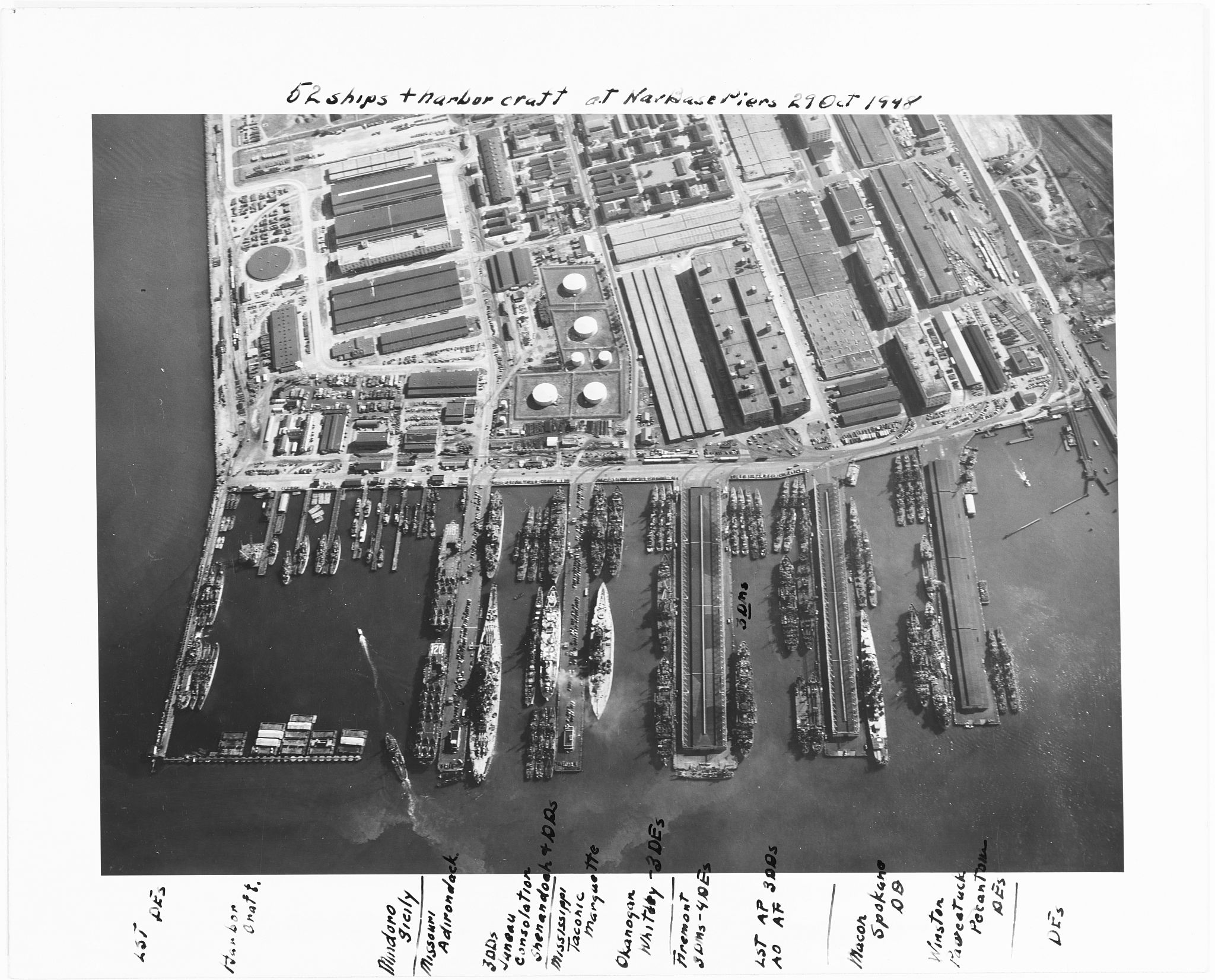 509k | Aerial photograph of the Norfolk Naval Base, Virginia, pier area, taken from an altitude of 2500 feet on 29 October 1948. Fifty-two ships and harbor craft are present, including: