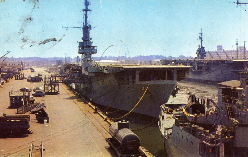 1.30M | Reserve Fleet Basin, Philadelphia Naval Shipyard, Pennsylvania, photographed on 19 May 1955 with numerous cruisers, escort carriers, and auxiliaries in reserve. The nearest ship is the never-completed Hawaii (CB-3), which lacks her previously-installed three 12" gun turrets. The cruisers outboard of Hawaii are (in unknown order) Honolulu (CL-48), Columbia (CL-56), Denver (CL-58), Galveston (CL-93), and Portsmouth (CL-102). To their left are Tranquility (AH-14), Sanctuary (AH-17), and Pocono (AGC-16). Behind Hawaii (from left to right) are Montpelier (CL-57), Houston (CL-81), Huntington (CL-107), Savannah (CL-42), Cleveland (CL-55), and Wilkes Barre (CL‑103). Beyond them (from left to right) are Wichita (CA-45), Oregon City (CA-122), Chester (CA-27), and New Orleans (CA-32). The cruisers on the left side of the basin (from front to rear) are Minneapolis (CA-36), Tuscaloosa (CA-37), San Francisco (CA-38), Augusta (CA-31), Louisville (CA-28), and Portland (CA-33). Among the other ships in reserve in the basin are Fomalhaut (AE-20), Webster (ARV-2), Albemarle (AV-5), Tangier (AV-8), Pocomoke (AV-9), Chandeleur (AV-10), Abatan (AW-4), Mission San Carlos (AO-120), Prince William (CVE-31), Anzio (CVE-57), Block Island (CVE-106), Palau (CVE-122), and San Carlos (AVP-51). Moored in the shipyard at the extreme left are Tennessee (BB-43), California (BB-44), and Cabot (CVL-28). Official U.S. Navy Photograph, now in the collections of the National Archives (# 80-G-668655). |