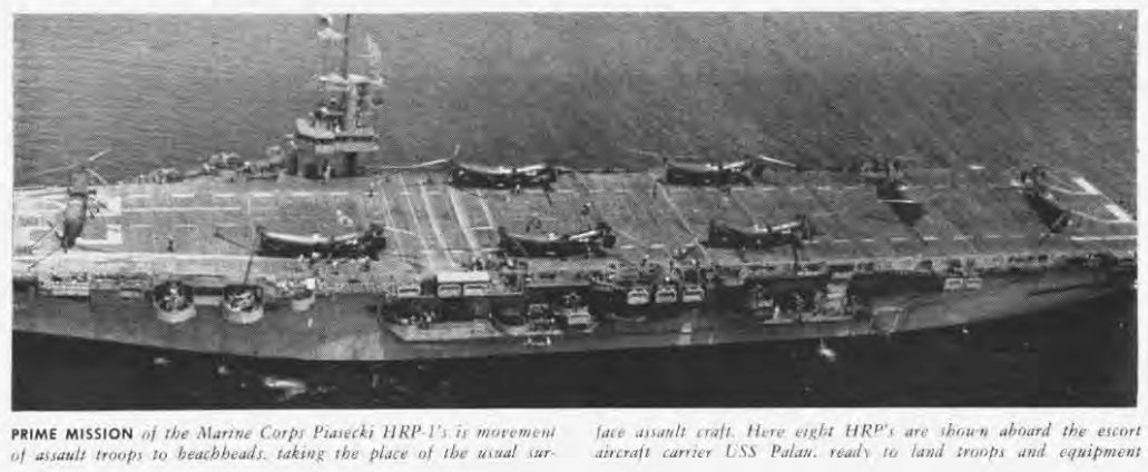 82k | "PRIME MISSION of the Marine Corps Piasecki HRP-1's [Flying Bananas] is movement of assault troops to beachheads, taking the place of the usual surface assault craft. Here eight HRP's are shown aboard the escort aircraft carrier USS Palau [(CVE-122)], ready to land troops and equipment." Naval Aviation News, August 1951 issue. |