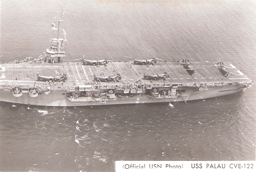 43k | CVE-122 (later AKV-22) was named Palau after a group of islands of the West Caroline Group, in the western Pacific (NS0312214), some 850 miles east of Mindanao, Philippine Islands, which was the scene of hostile land, sea, and air action between American and Japanese forces in World War II. The United States captured Palau from Japan after the costly Battle of Peleliu (NS0312214a), September–November 1944. NS0556206: USS Robinson (DD-562) fires 40mm guns to cover underwater demolition team men clearing beach obstacles in mid-September 1944, prior to landings on Peleliu by the First Marine Division. (National Archives and Records Administration photo # 80-G-257701, via Tony Cowart.) |
