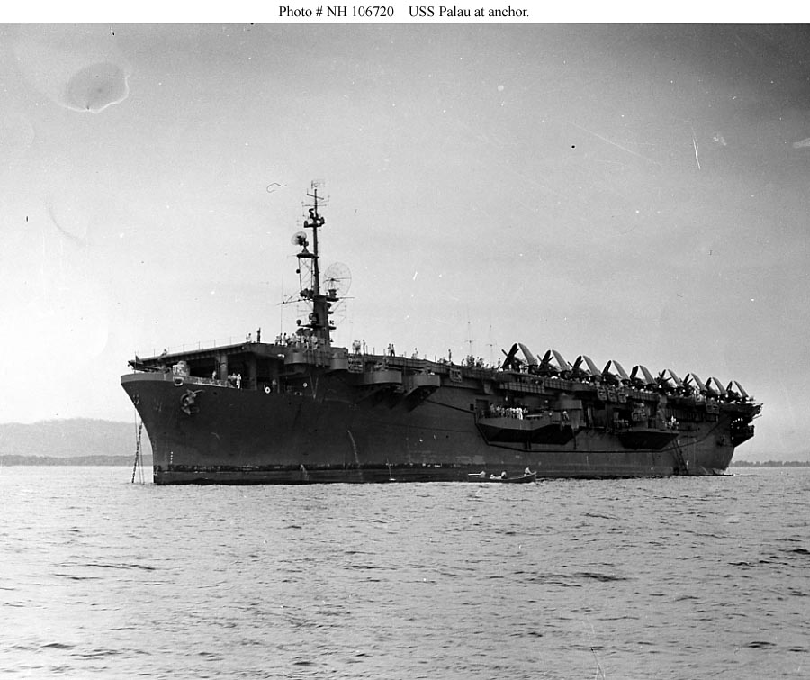 101k | USS Palau (CVE-122) at anchor, with F4U Corsair fighters parked on her flight deck. The original photograph is dated July 1947. Official U.S. Navy Photograph, from the collections of the Naval History and Heritage Command (# NH 106720). |