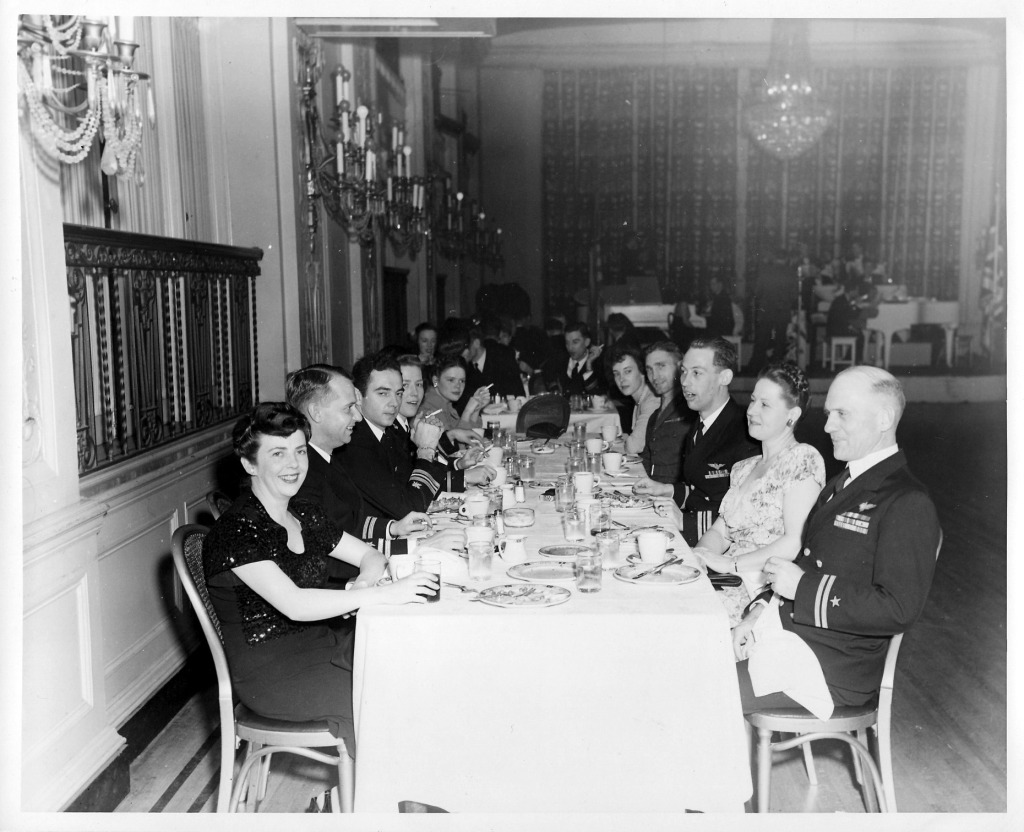 183k | Officers of the escort carrier Palau (CVE-122) pictured at dinner in Tacoma, Washington, around the time of her launching or commissioning (1945–1946). Seated in the right foreground is Lieutenant W.C. Fitzpatrick and at center is Captain W.E. Cleaves, Palau's commanding officer. Photo courtesy of the National Naval Aviation Museum. |