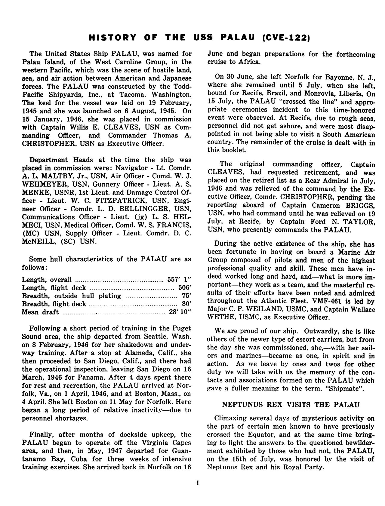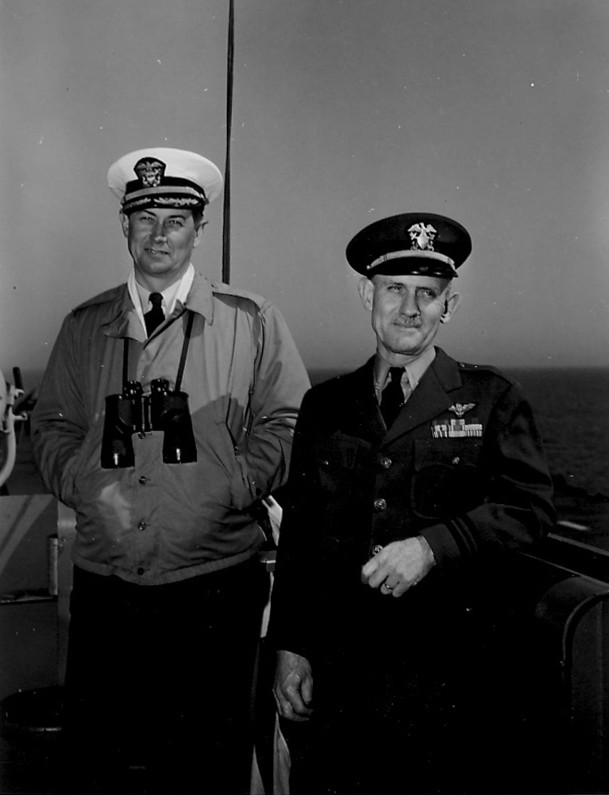 75k | 1946—Captain Willis E. Cleaves, commanding officer of the escort carrier USS Palau (CVE-122), pictured on the bridge of the ship with Lieutenant Commander W.C. Fitzpatrick. Photo courtesy of the National Naval Aviation Museum. |