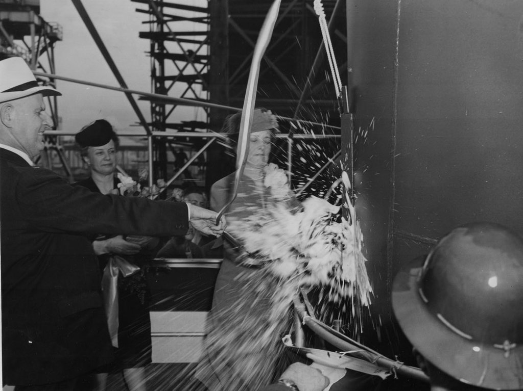 109k | Palau (CVE-122) was launched on Monday, 6 August 1945, sponsored by Mrs. Whitney, wife of CAPT John P. Whitney, CO of USS Kitkun Bay (CVE-71) during the Battle of Leyte Gulf, in October 1944. Mrs. Bridgett to the left. NS0312211: National Archives photo (# 80-G-326720). NS0312211a: National Archives photo (# 80-G-326721). |