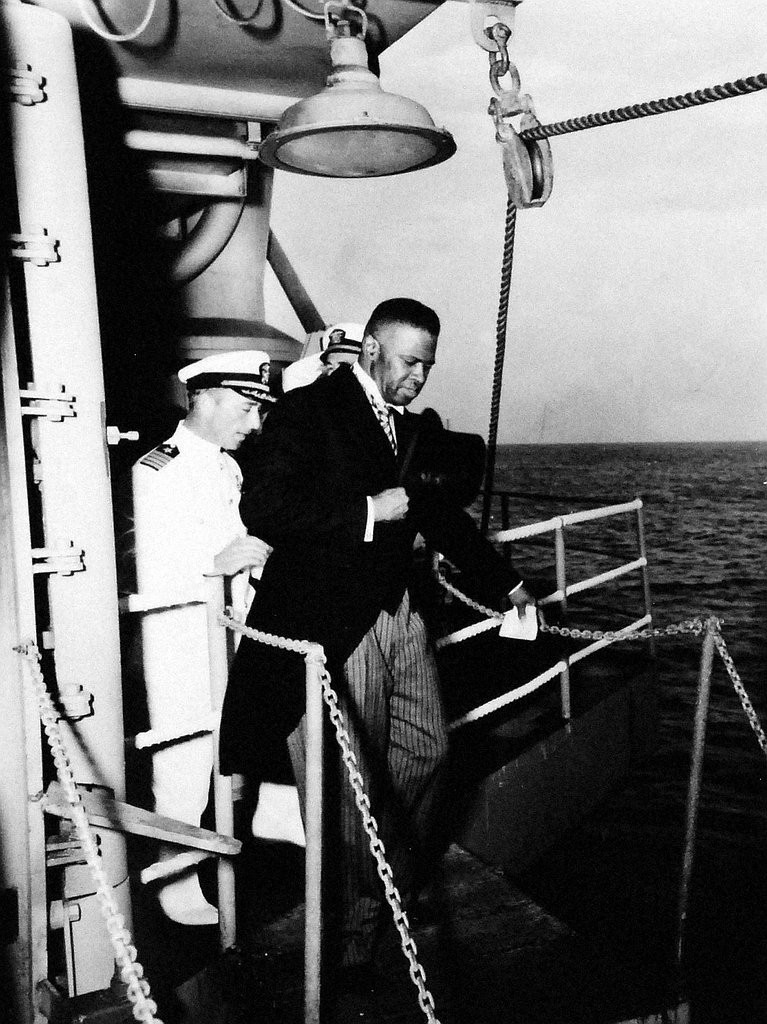 179k | USS Palau (CVE-122), with American Minister Lanier aboard, at Monrovia, Liberia, for Centennial Ceremonies. Photograph released 25 July 1947. Official U.S. Navy photograph, now in the collections of the National Archives and Records Administration (NARA), # 80-G-399800. |