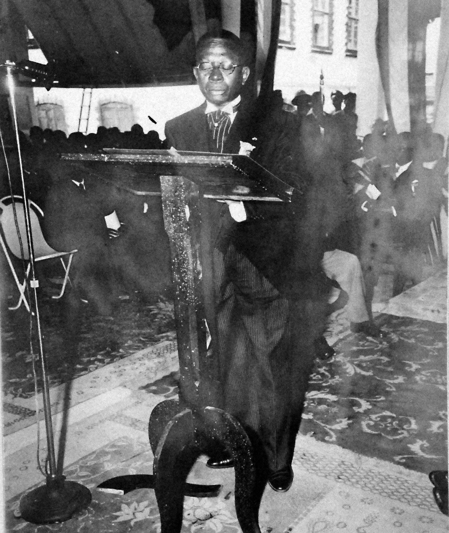 584k | USS Palau (CVE-122) for Centennial Ceremonies at Monrovia, Liberia. Shown: President William V.S. Tubman delivers address at Civic Center. Photograph released 26 July 1947. Official U.S. Navy photograph, now in the collections of the National Archives and Records Administration (NARA), # 80-G-399830. |