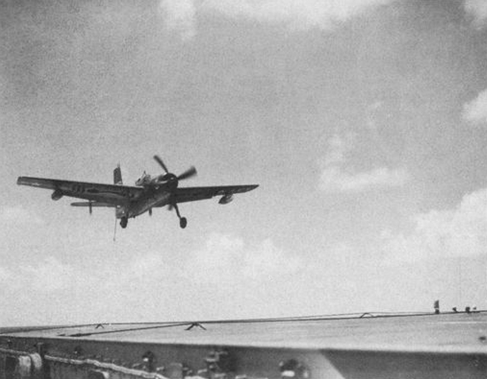 183k | A U.S. Navy Grumman AF-2S Guardian of Air Anti-Submarine Squadron (VS) 31 "Topcats" landing aboard the escort carrier USS Palau (CVE-122). VS-31 was assigned to Palau for a deployment to the Mediterranean Sea from 19 April to 28 June 1952. U.S. Navy photo from the Palau 1952 Cruise Book. |