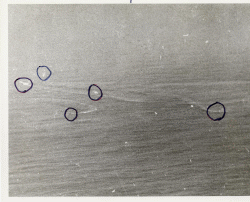 Puckett and Weigle dove on U-264, Puckett spraying the deck and Weigle thinking he was firing his .50-cal's, released all four of his depth bombs, falling too far to be effective. Stearns dove at U-264 thinking it was the milch cow. When he reached the drop point, there was no indication of U-264's position so he didn't waste his FIDO. He turned to attack U-460 as it was diving. She didn't leave a swirl but a trail of green water could be seen.