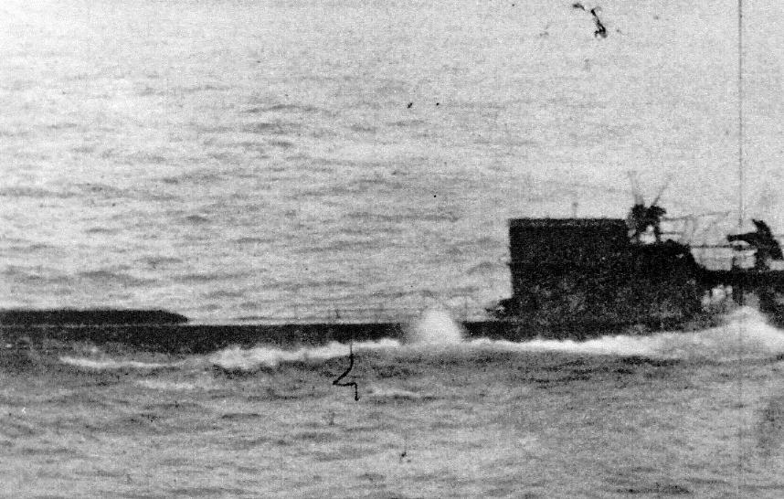![]() U-66 (left) and U-117 under attack. The 2,177-ton (submerged) U-117 was sunk on her 5th patrol. |