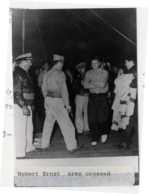Watching Fryatt arrive was Roger Kuhn, his room mate. Fryatt hit Kuhn's plane that he was standing on and holding a flash light so his friend could see the deck. He was knocked overboard and the flash light kept working. He was seen by the U.S.S. Barry who picked him up with a slight leg injury and a soaking.
