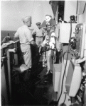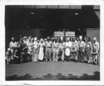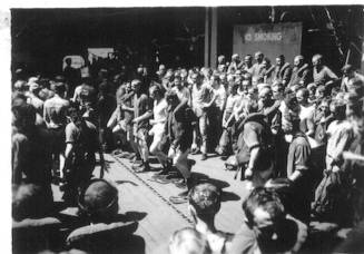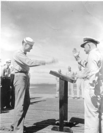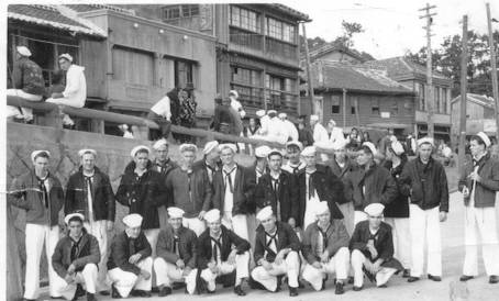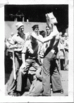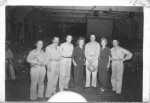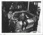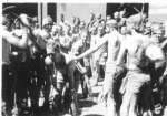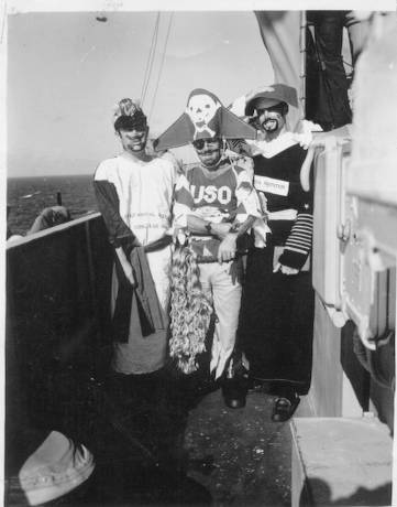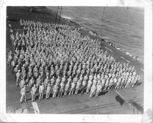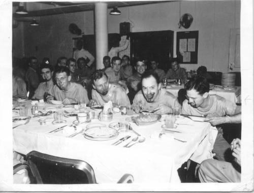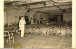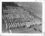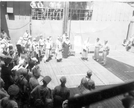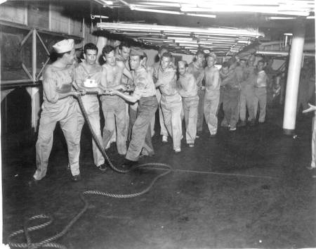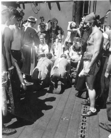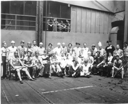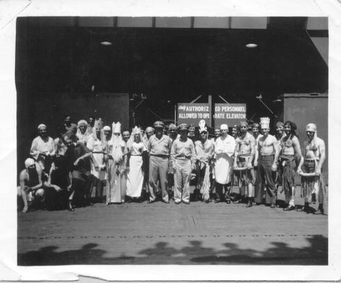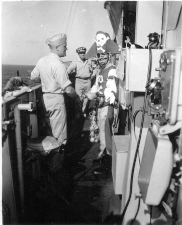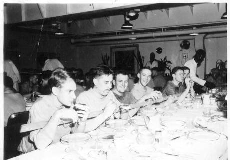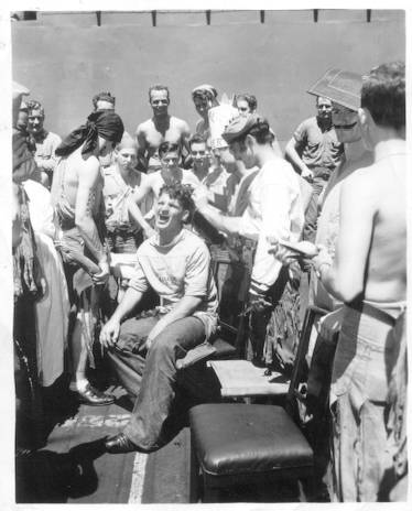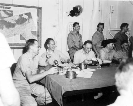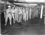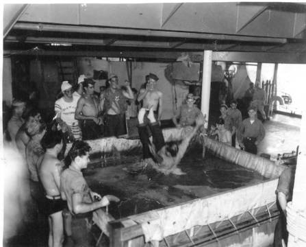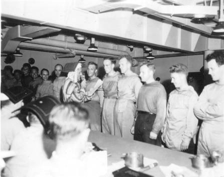 17 26 Kb Officer Pollywogs in crews' mess hall. Tables stored overhead. Ship's service store at left of photo. |