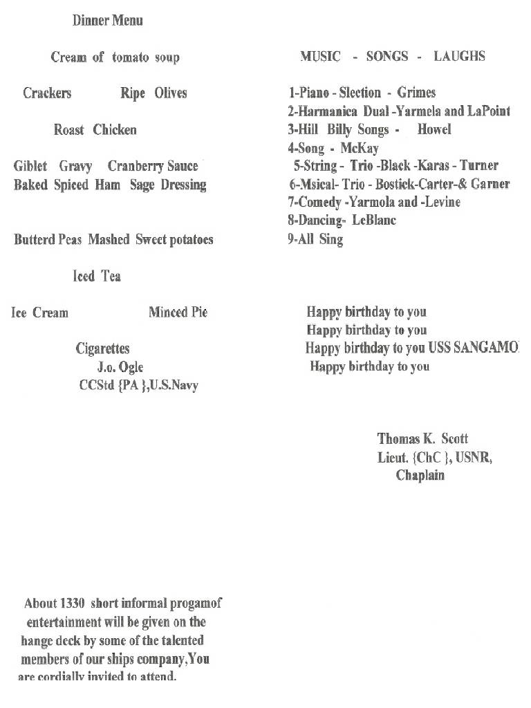 30k | First Anniversary Menu, August 25th, 1943. Sangamon was en route to Mare Island Naval Base in California after duty in the South Pacific. Submitted by Hank Millan. |