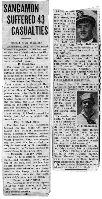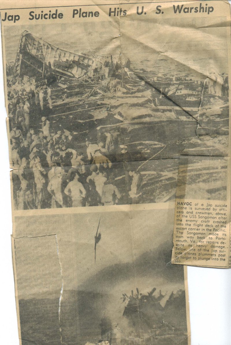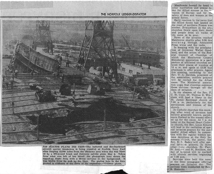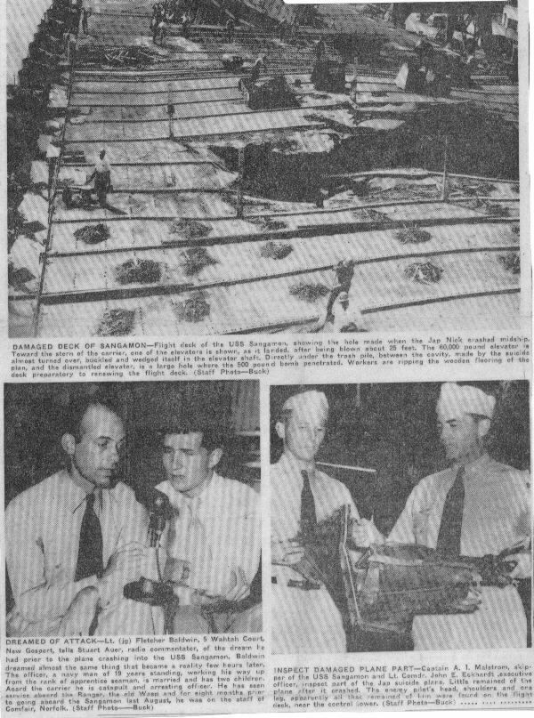 "Carrier Sangamon Repaired Here After Losing 35 in Jap Air Raid." The Norfolk Ledger-Dispatch.