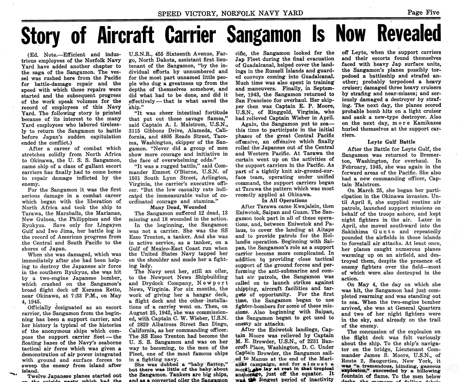 "Story of Aircraft Carrier Sangamon Is Now Revealed" Speed Victory - Norfolk Navy Yard. August 23, 1945. Page 5.