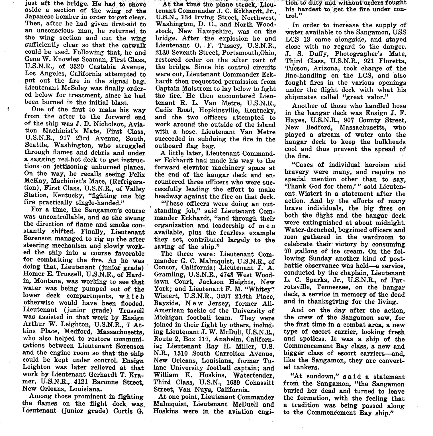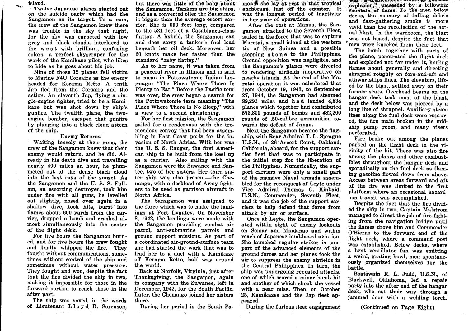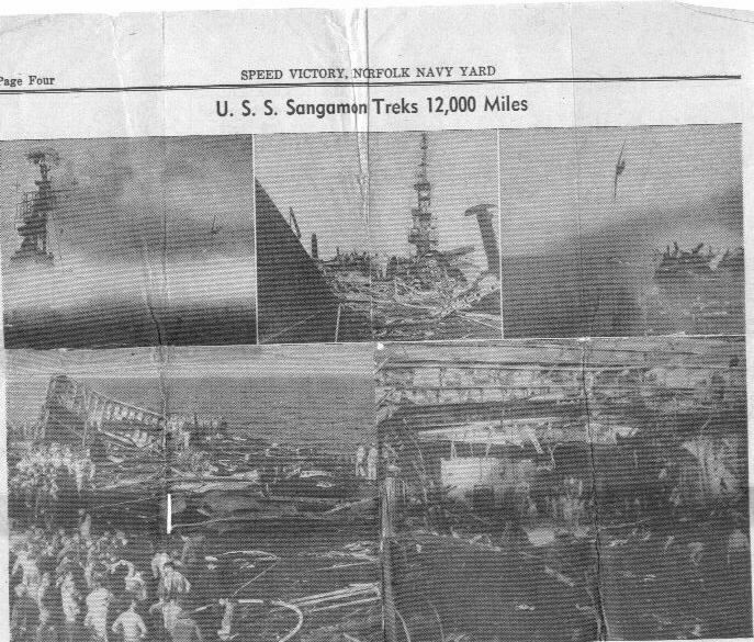 "Story of Aircraft Carrier Sangamon Is Now Revealed" Speed Victory - Norfolk Navy Yard. August 23, 1945. Page 8.