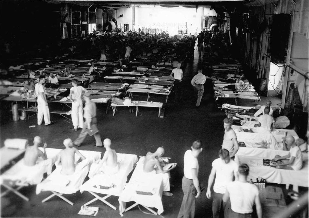 ![]() NS-03-cve29-bd4817 At 0756, sixteen minutes after the kamikaze hit, a torpedo chewed into Santee's starboard side between frames 58 and 60. (111 Kb) |