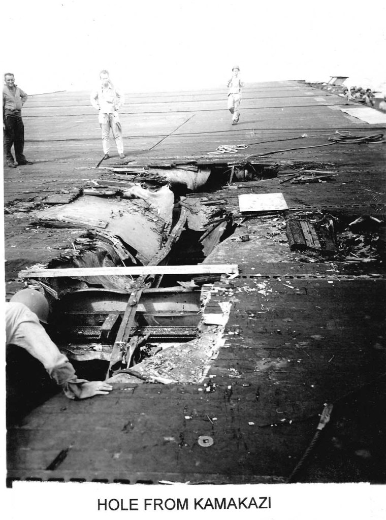 ![]() NS-03-cve29-bd1308 Damaged flight deck of Santee after kamikaze hit. (156 Kb) |