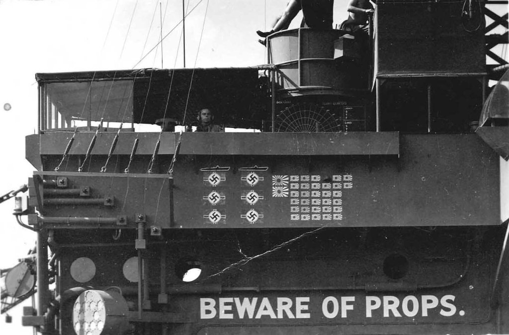 ![]() NS-03-cve29-bd7321 Scoreboard, German subs and Japanese aircraft, painted on the island (115 Kb) |