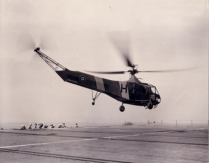 69k | A British Hoverfly I landing and onboard USS Charger. The US-manufactured Sikorsky R-4B, known as Hoverfly I in British service, was the first helicopter in the world to be put into series production and the first military helicopter to be operated in sizeable numbers. Under the designation HNS-1, 68 R-4s were accepted by the US Navy between October 1943 and December 1944. |