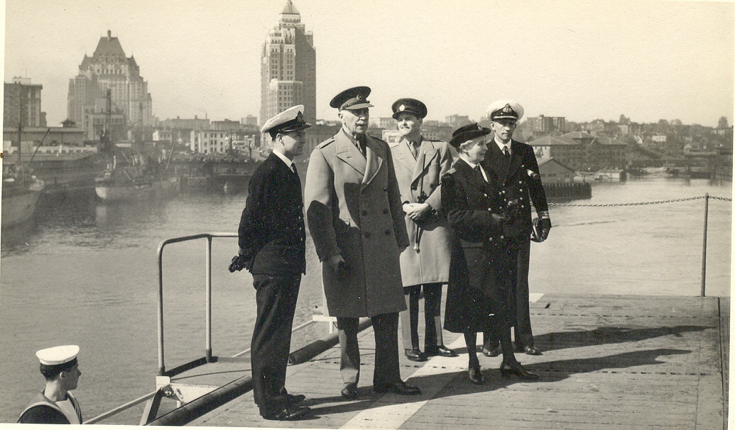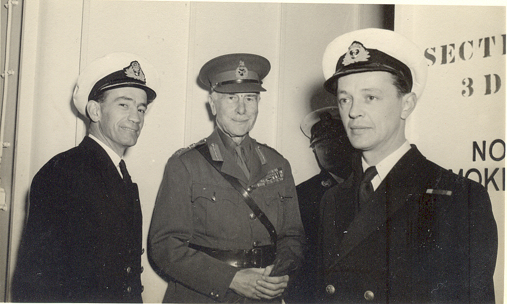 ![]() 100K 581K NS-03-cve52-o16 1944: Esquimalt - visit of Governor of Canada. Left, Ship's Captain. Right, Ship's Doctor |