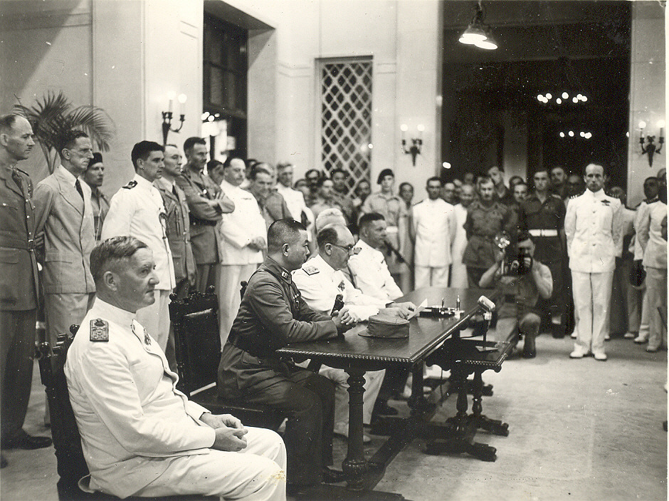 ![]() 130K 504K NS-03-cve52-o19 1945: Surrender of Hong Kong. Centre of table, Admiral Harcourt. Foreground, Admiral Fraser. Captain Richardson attended |
