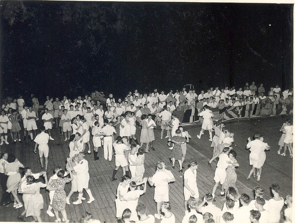 ![]() 160K 687K NS-03-cve52-o20 1945: After disembarkation of Spitfires HMS Smiter transported ex-internees. This is a dance for their benefit |
