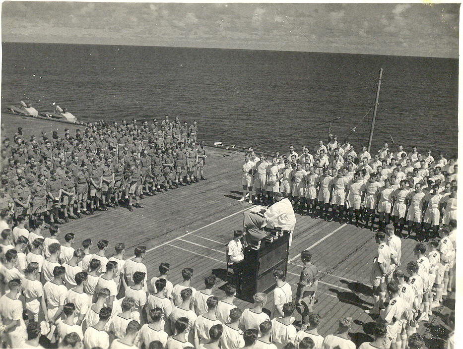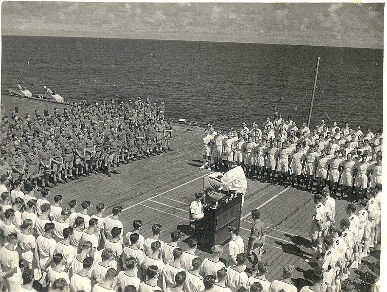 ![]() 170K 588K NS-03-cve52-o21 1945-1946: Church parade on flight-deck during transport of army personnel from Java. Pianist is Don Howard (PO/RM637443). |