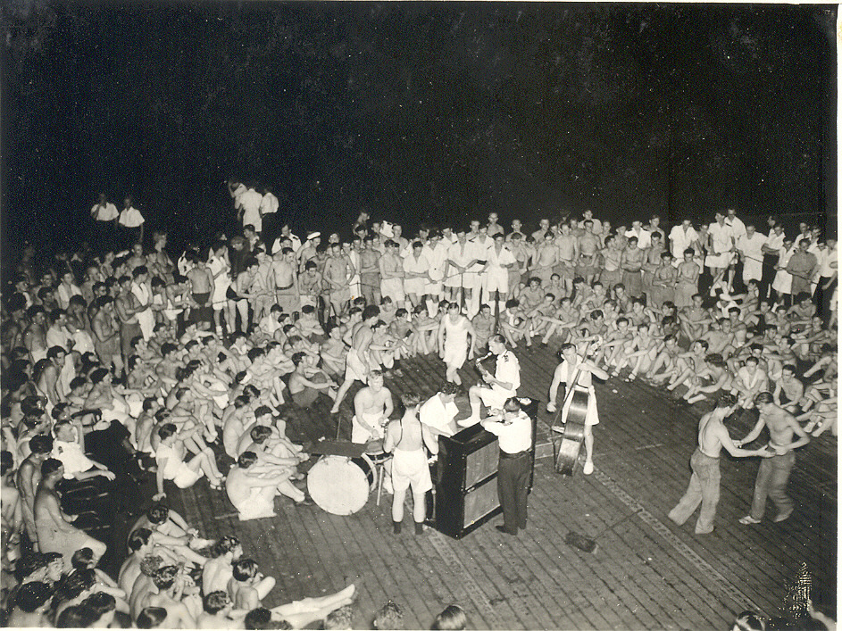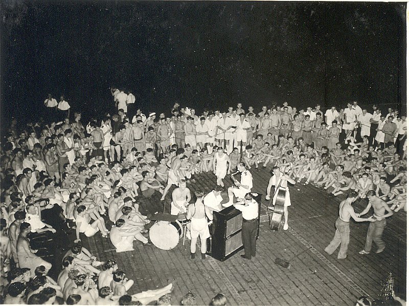 ![]() 167K 727K NS-03-cve52-o22 1945-1946: Entertainment on flight deck. Pianist is Don Howard (PO/RM637443). |