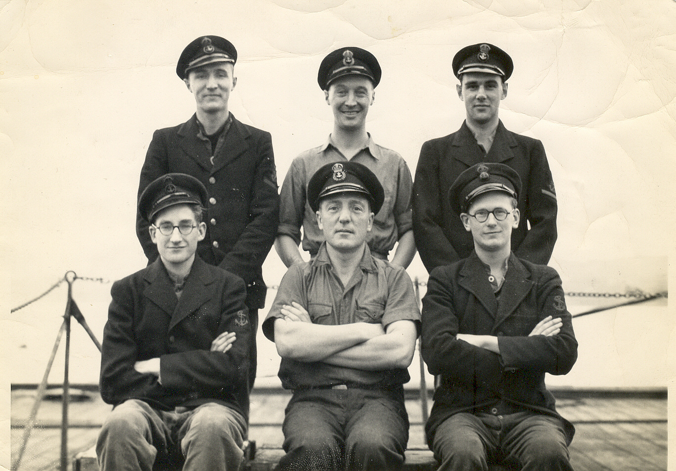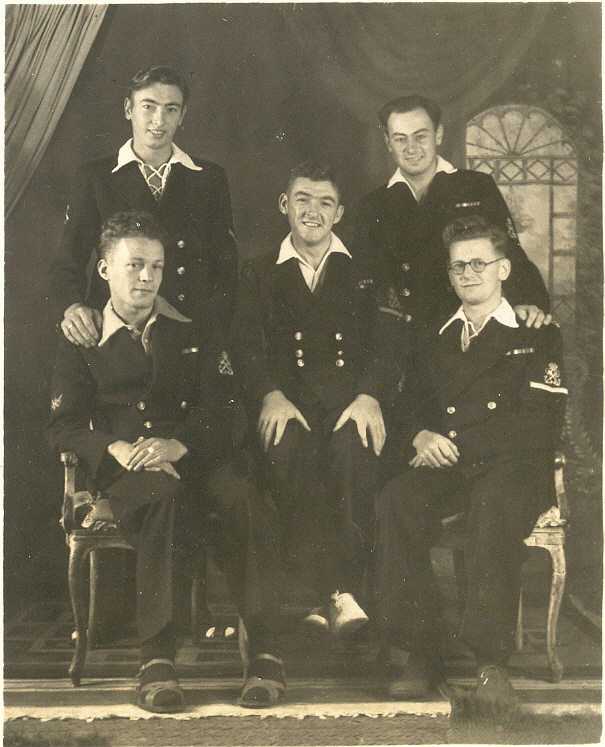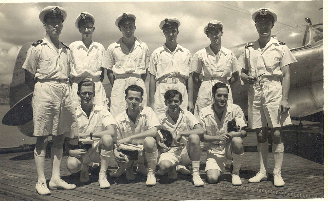 ![]() 118K 513K NS-03-cve52-op3 Electrical Team - South China Sea, 1945 Standing (l to r): Lieut Preston, Bill Barford, Gilbert Husk, Fred Foster, Don Howard, Sub-Lieut Howatt Sitting (l to r): Terry Oxley, Harry White, ?, Eddy Neal |