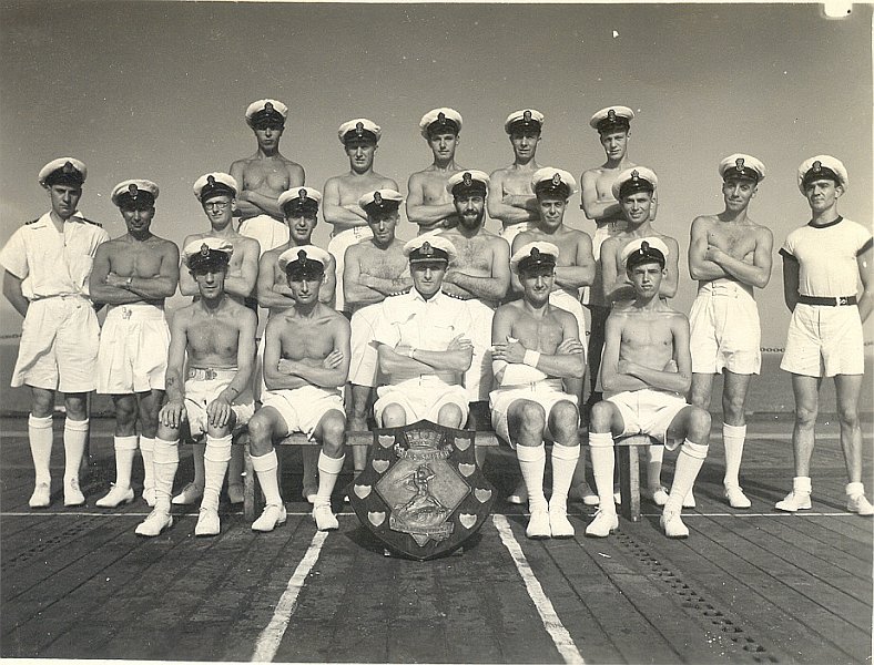 ![]() 137K 446K NS-03-cve52-op5 Petty Officer's Sports Team, Far East, 1946. Terry is 3rd from left, middle row. Don Howard is sitting on the far right. |