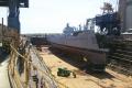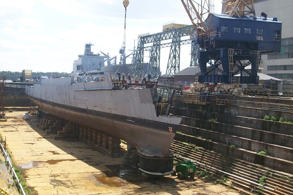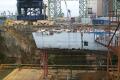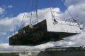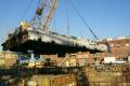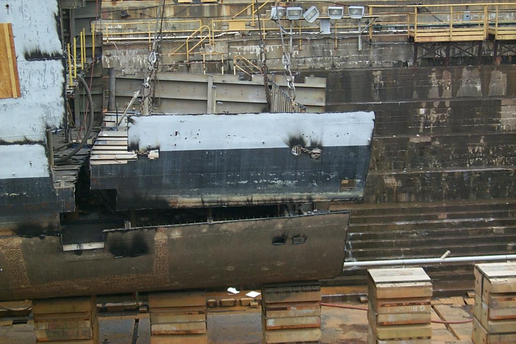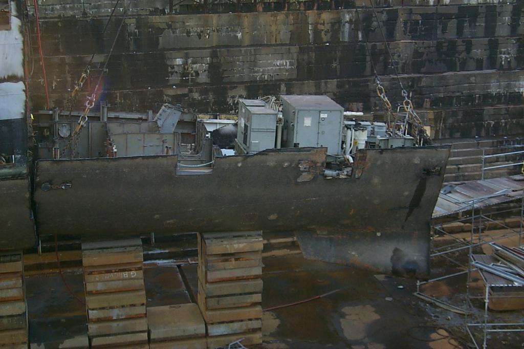 sitting on the floor of the drydock ready to be lifted out and
