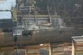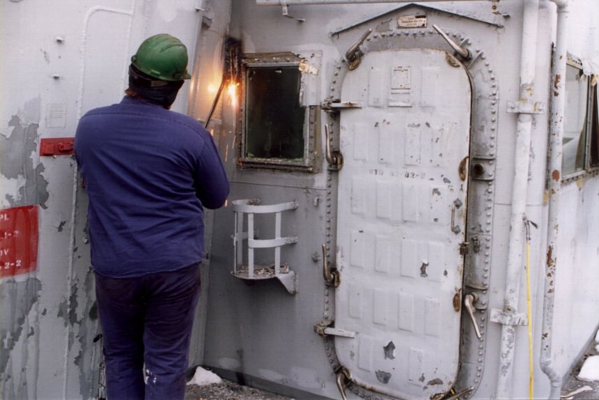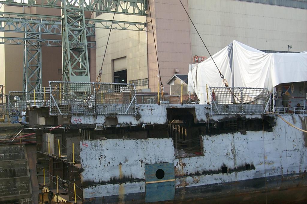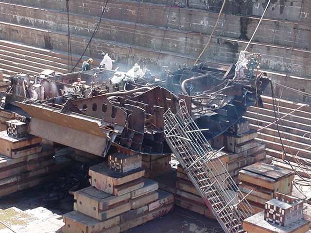 Workmen torching through hull |