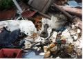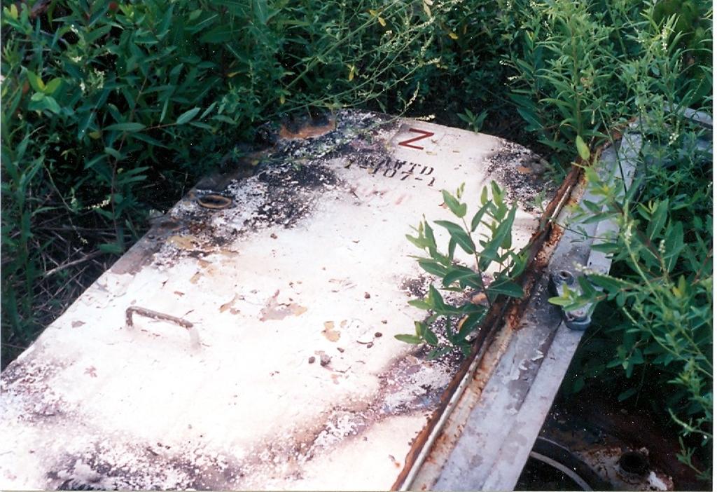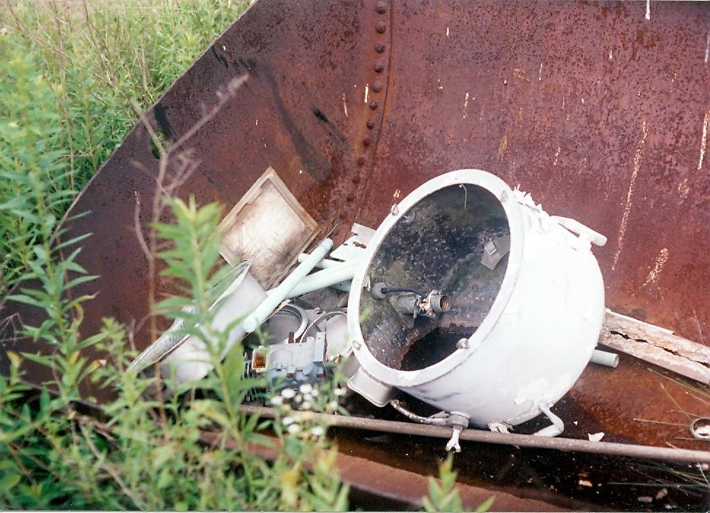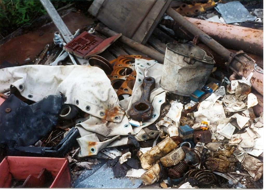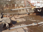 Miscellaneous scrap--quarter of a thru deck hatch still dogged, vent fan, tank parts. |
