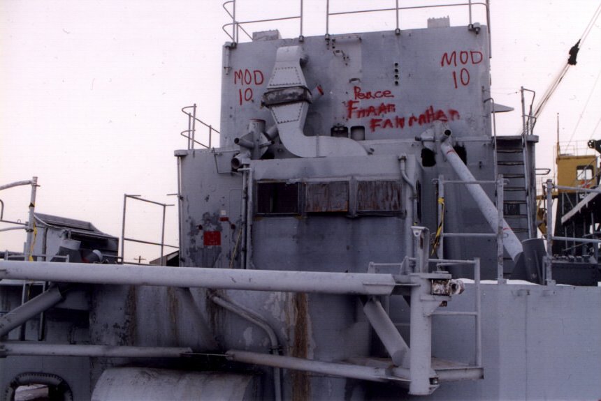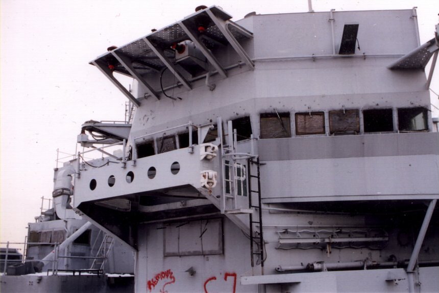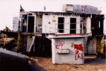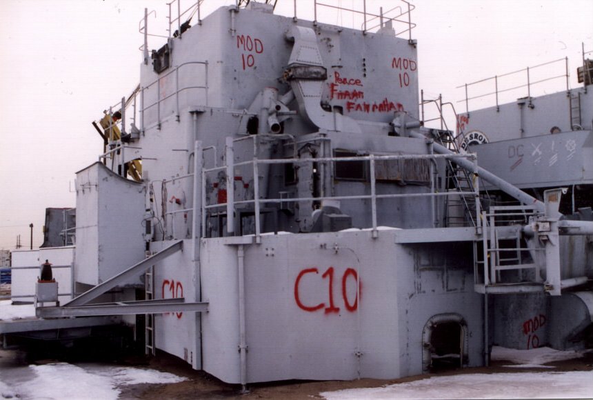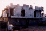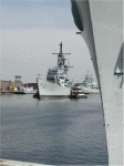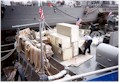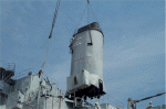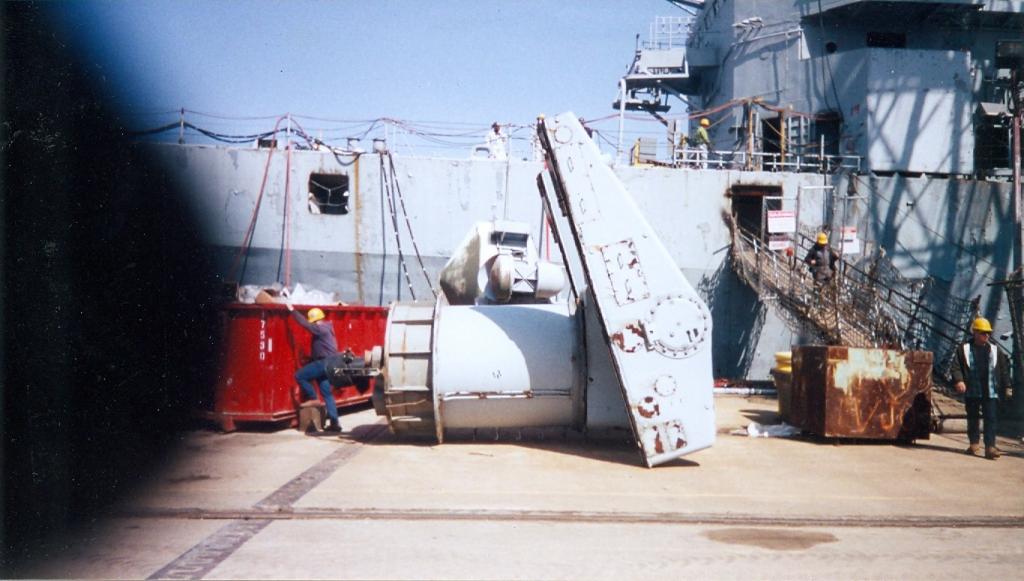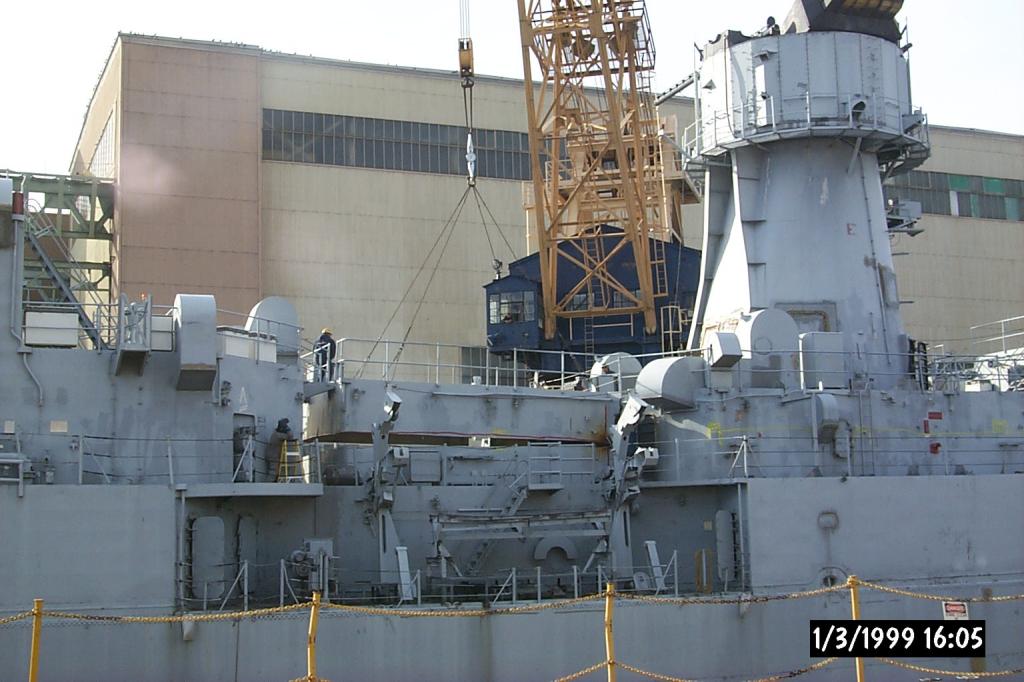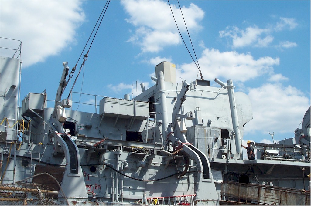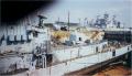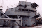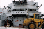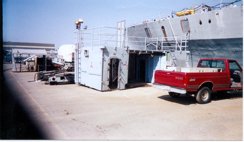 USS Biddle, May 2001, module 2 on pier from upper decks--notice the missile rails mbehind the module burned in pieces. The water tight door and dogs were just removed by me and are in my truck along with stateroom furniture. |