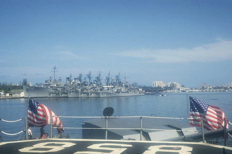 110k | USS Sierra (AD-18) at San Juan, Puerto Rico, 26 February 1967 with six destroyers alongside; USS Basilone (DD-824), USS Fiske (DD-842), USS Davis (DD-937), USS Richard E Kraus (DD-849), USS Harwood (DD-861), USS Gyatt (DD-712) |