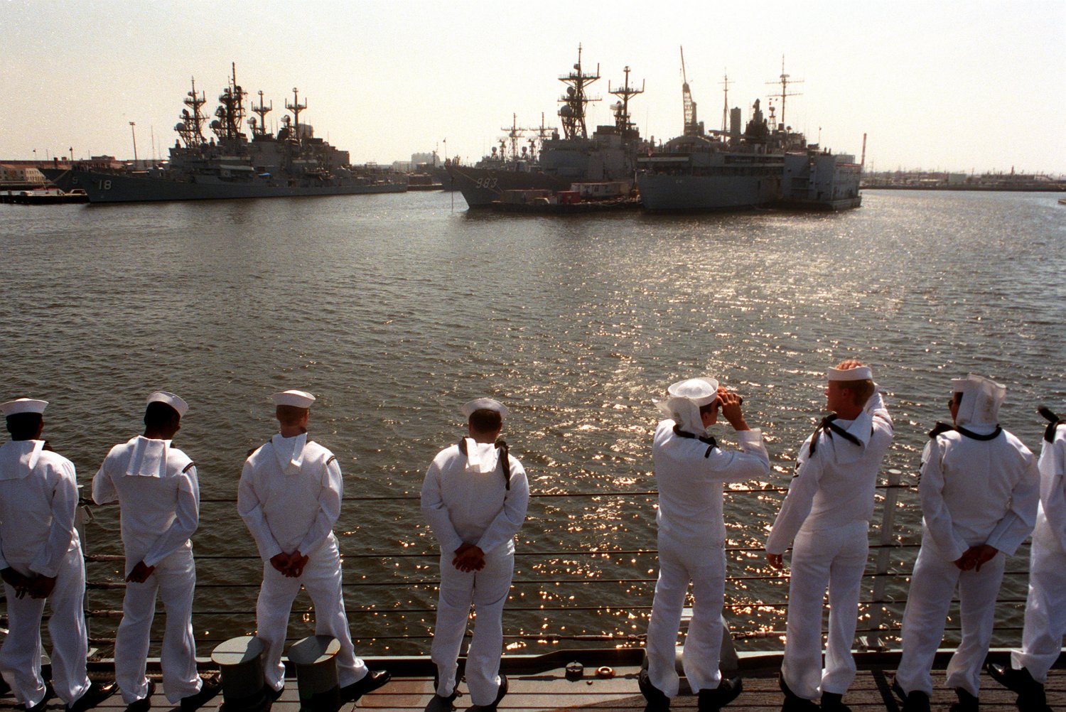 Pakistani Navy, where it will be commissioned PNS SIQQAT. In the background is USS Sierra (AD-18), 05/31/1989.
