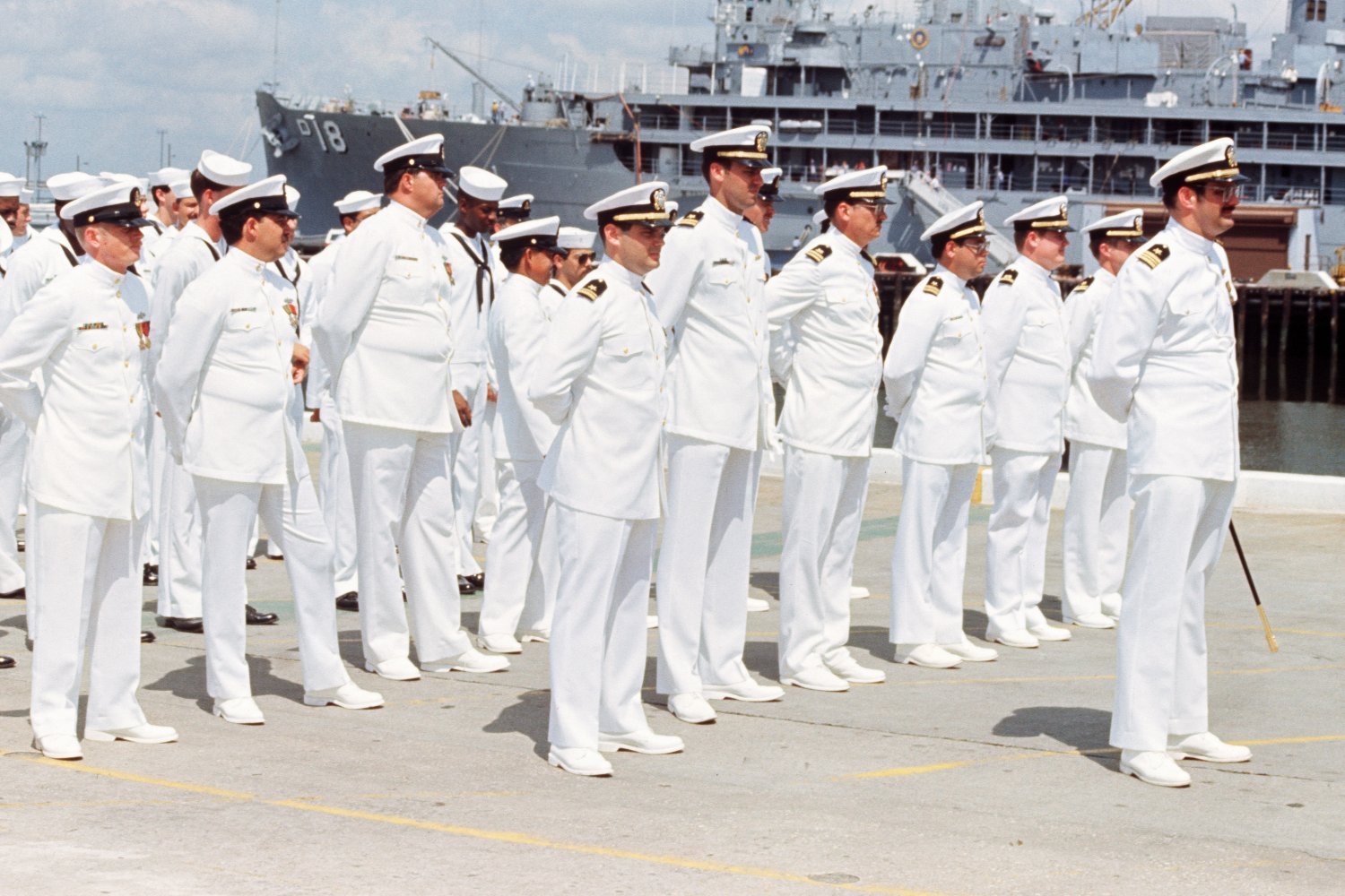 254k | Officers and crew of the frigate, USS Koelsch (FF-1049) stand at ease before ceremonies transferring the ship to the