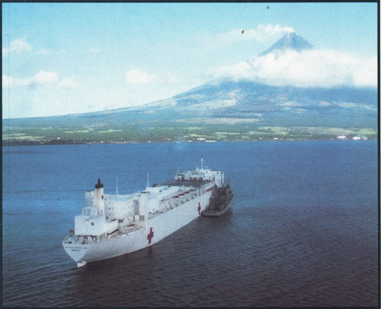 91k | USNS Mercy (T-AH-19) anchored off Luzon, Philippine Islands in 1987. Mercy set sail, 27 February 1987, on her shakedown cruise, which included performing a humanitarian mission to the Republic of the Philippines. The four-month mission was designed to train Military Sealift Command (MSC) and Navy personnel in the operation and support of the ship and its Medical Treatment Facility during extended operations in remote areas. An average of ten days was spent at the following deployment sites: Subic Bay, Luzon (first and last); Legazpi, Luzon; Davao and Zamboangna, Mindanao; Puerto Princesa, Palawan; Cebu City, Cebu and finally Calbayog, Samar. The Medical Crew was made up of active duty and reserve Navy, Army, Air Force and Public Health Service personnel. After this mission Mercy returned to her new homeport at the US Naval Supply Center, Oakland, CA. US Navy photo by PHC Chet King USN, from "All Hands" magazine, November 1987. |