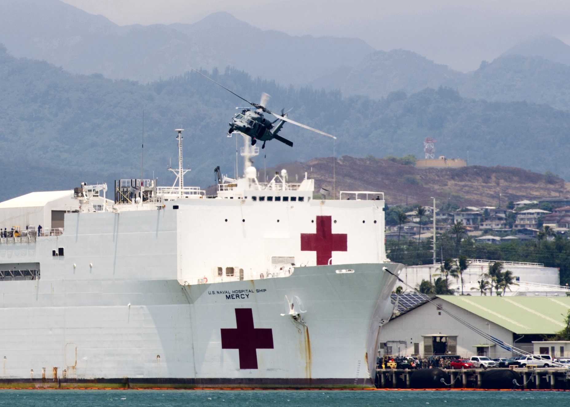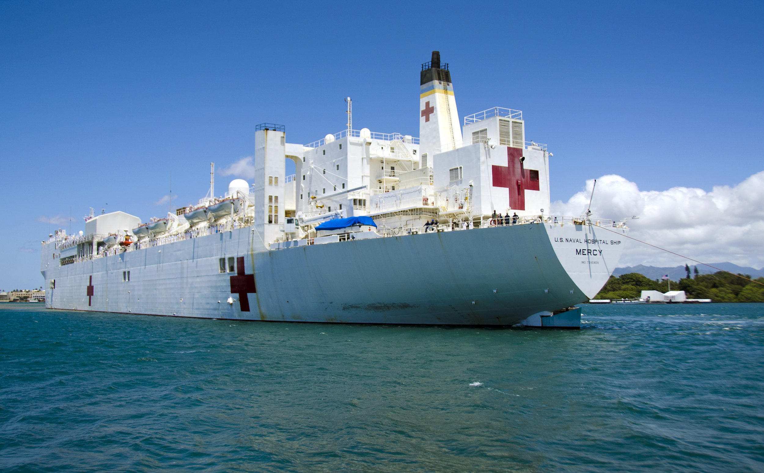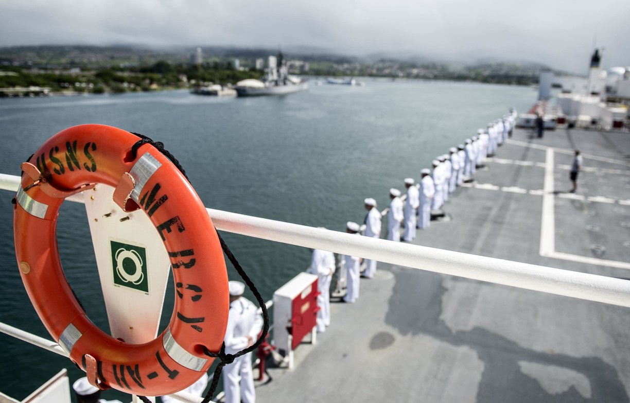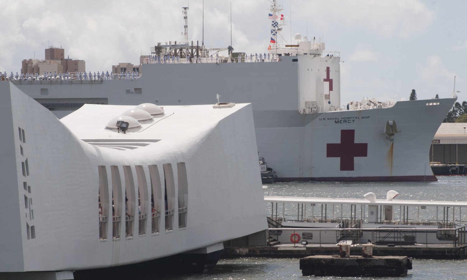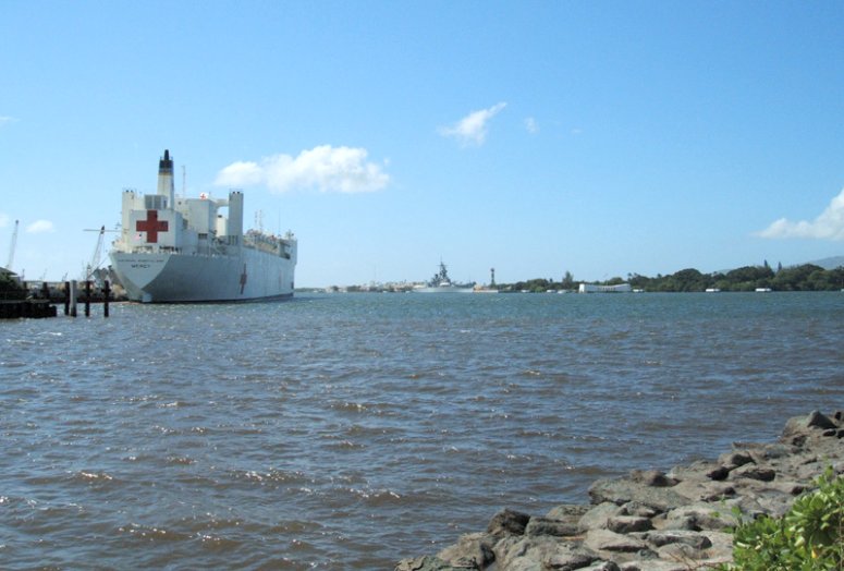 149k | USNS Mercy (T-AH 19) passes the USS Arizona Memorial as she arrives at Joint Base Pearl Harbor-Hickam after