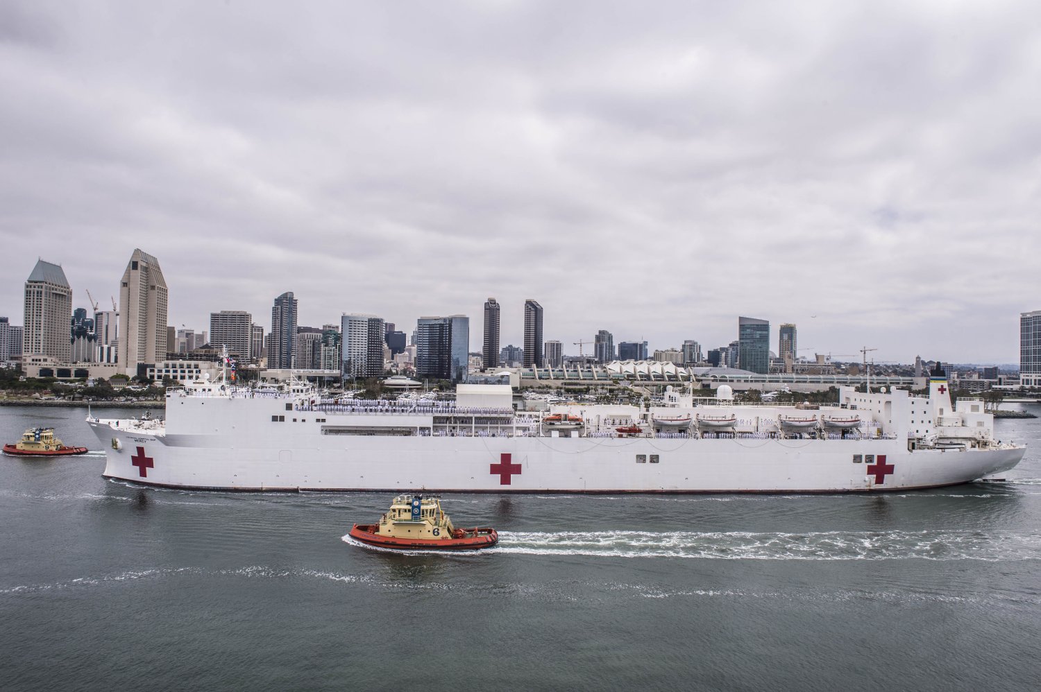 unidentified tug, departs Los Angeles, CA., 15 May 2020. Mercy deployed in support of the nation's COVID-19 response efforts, and served as a referral hospital for non-COVID-19 patients