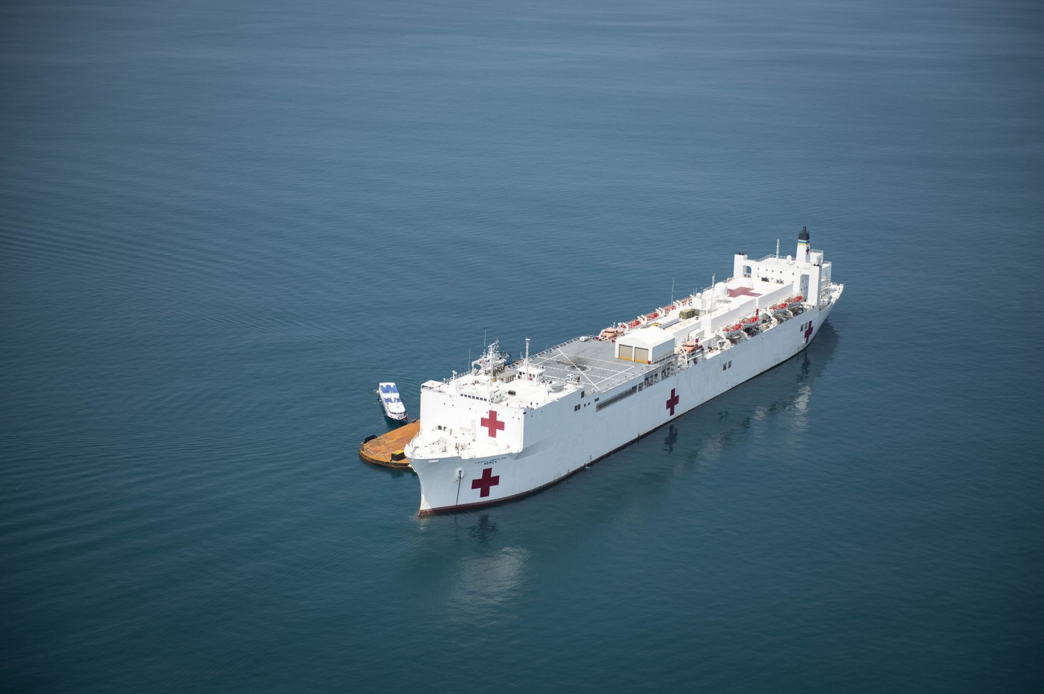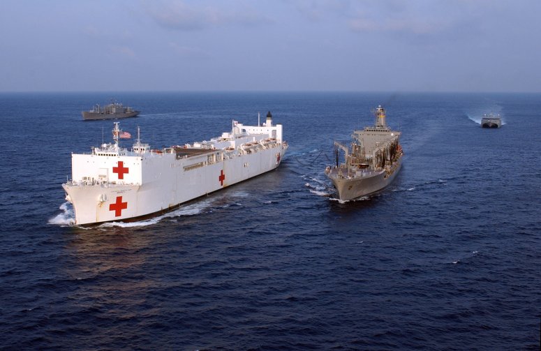 97k | USNS Mercy (T-AH-19) conducting a Replenishment At Sea (RAS) with USNS Pecos (T-AO-197) while underway in the Pacific Ocean, 16 May 2006. Mercy is on a scheduled five-month deployment to deliver aid and humanitarian assistance to the Pacific Islands and Southeast Asia.2006. The medical crew aboard Mercy will provide general and ophthalmology surgery, basic medical evaluation and treatment, preventive medicine treatment, dental screenings and treatment optometry screenings, eye wear distribution, public health training and veterinary services as requested by the host nations. Like all U.S. Naval forces Mercy is able to rapidly respond to a range of situations on short notice. Mercy is uniquely capable of supporting medical- and humanitarian-assistance needs and is configured with special medical equipment and a robust multi-specialized medical team who can provide a range of services ashore as well as aboard the ship. The medical staff is augmented with an assistance crew, many of whom are part of non-governmental organizations that have significant medical capabilities.