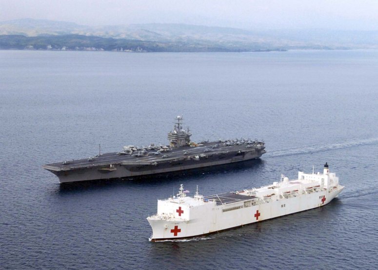 76k | USNS Mercy (T-AH-19) navigates alongside USS Abraham Lincoln (CVN 72) after arriving on station near Banda Aceh, Sumatra, Indonesia, 3 February 2005. Mercy has been forward deployed to assist in humanitarian aid efforts currently in progress. Mercy will serve as an enabling platform to assist humanitarian operations ashore in ways that host nations and international relief organization find useful. The Abraham Lincoln Carrier Strike Group has been operating in the Indian Ocean off the waters of Indonesia in support of Operation Unified Assistance the humanitarian relief effort to aid the victims of the tsunami that struck Southeast Asia. US Navy photo # 050203-N-6020P-137 by PH3 Gabriel R. Piper. | Navy NewsStand | |