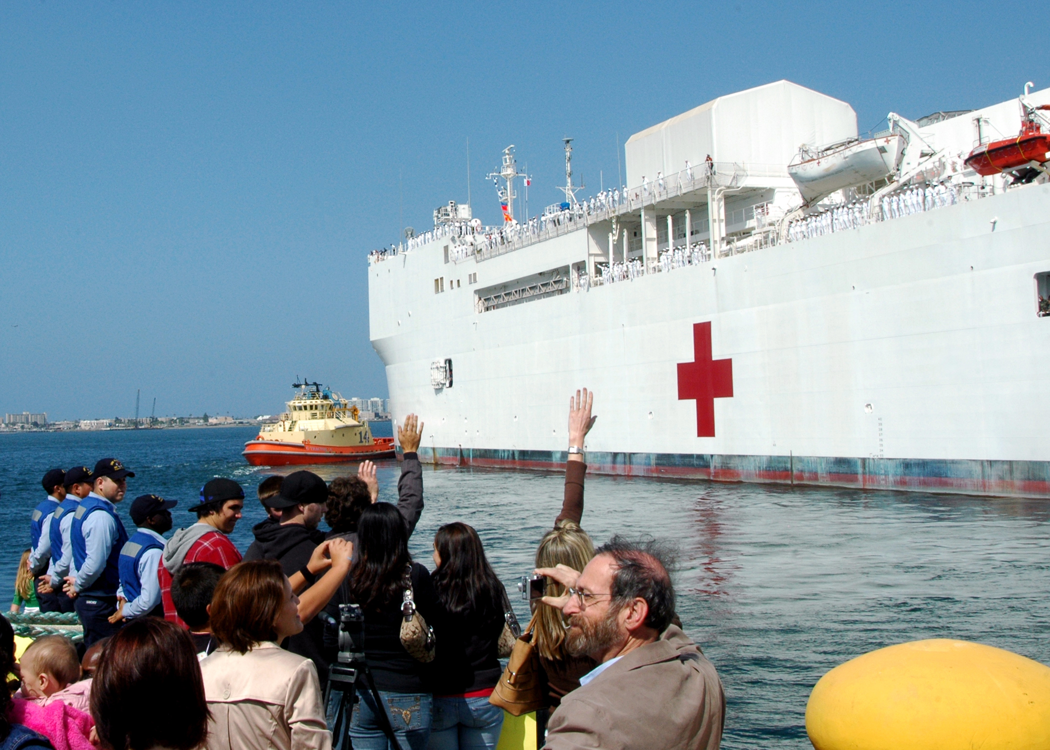 165k | USNS Mercy (T-AH-19) sailors man-the-rails as the ship prepares to pull pier side at Naval Station San Diego, 8 June 2005. Mercy was returning from a five-month deployment in support of tsunami relief efforts and humanitarian aide missions to several South Pacific nations. US Navy photo # 050608-N-1485H-002 by PH3 Lamel J. Hinton |