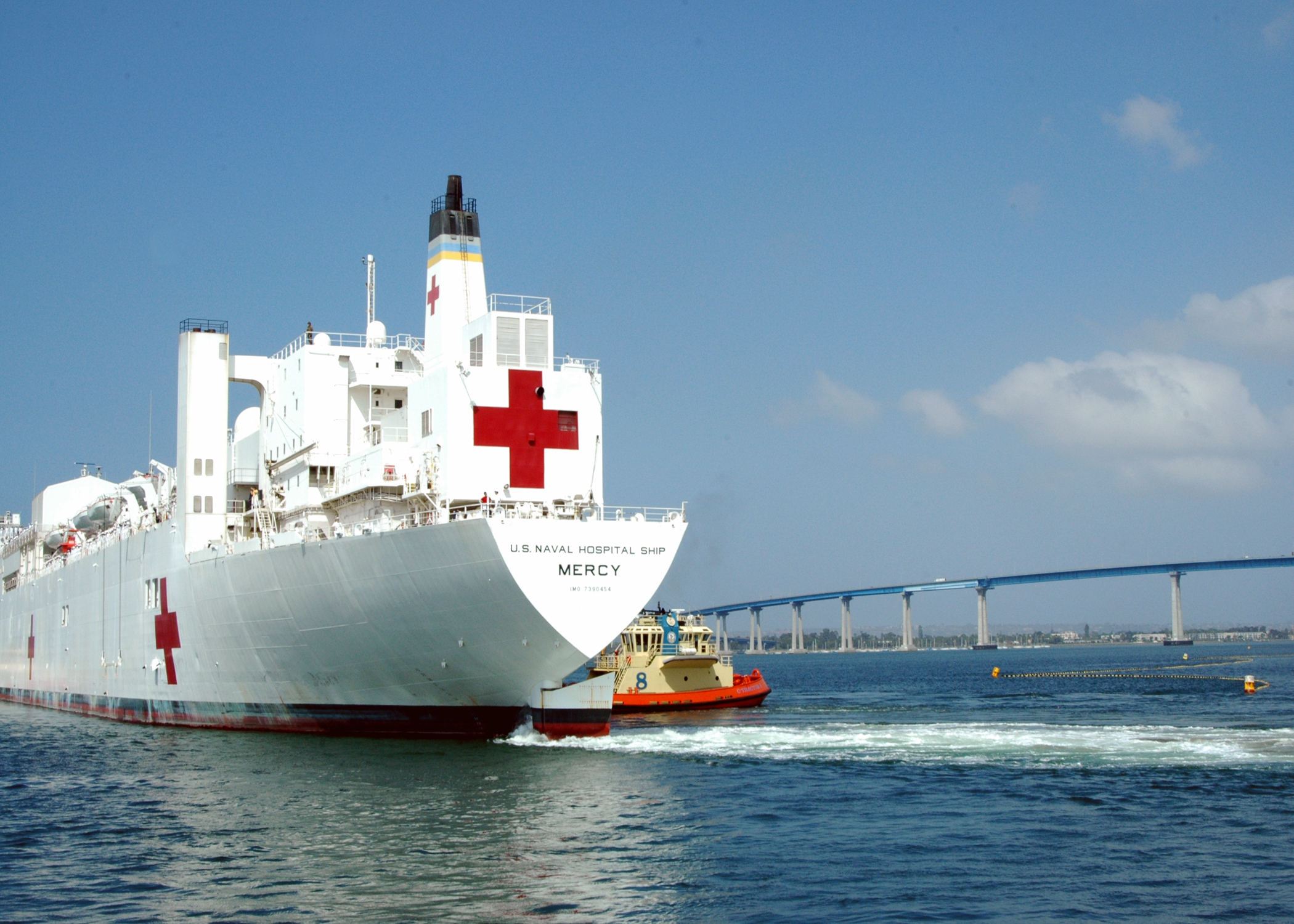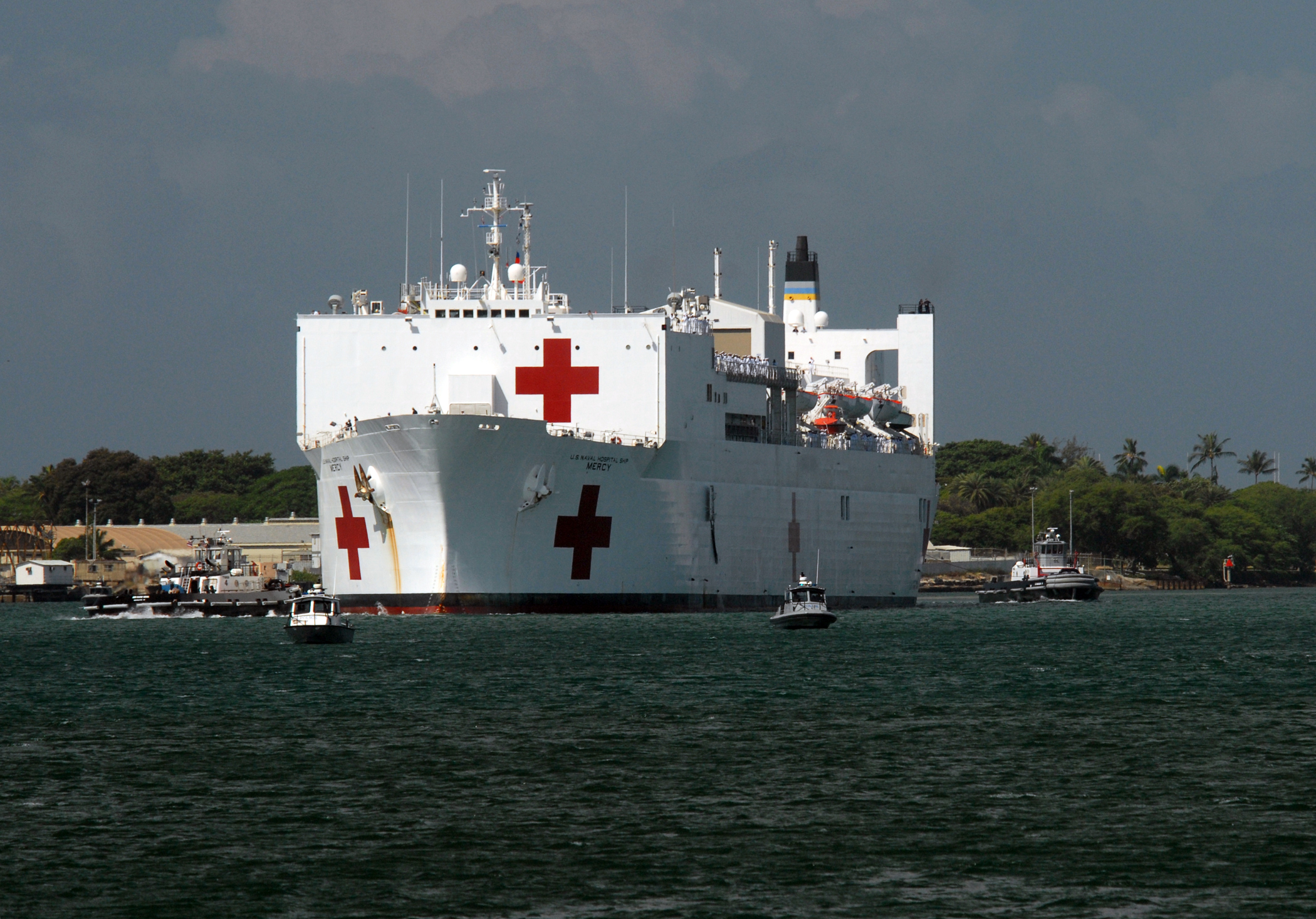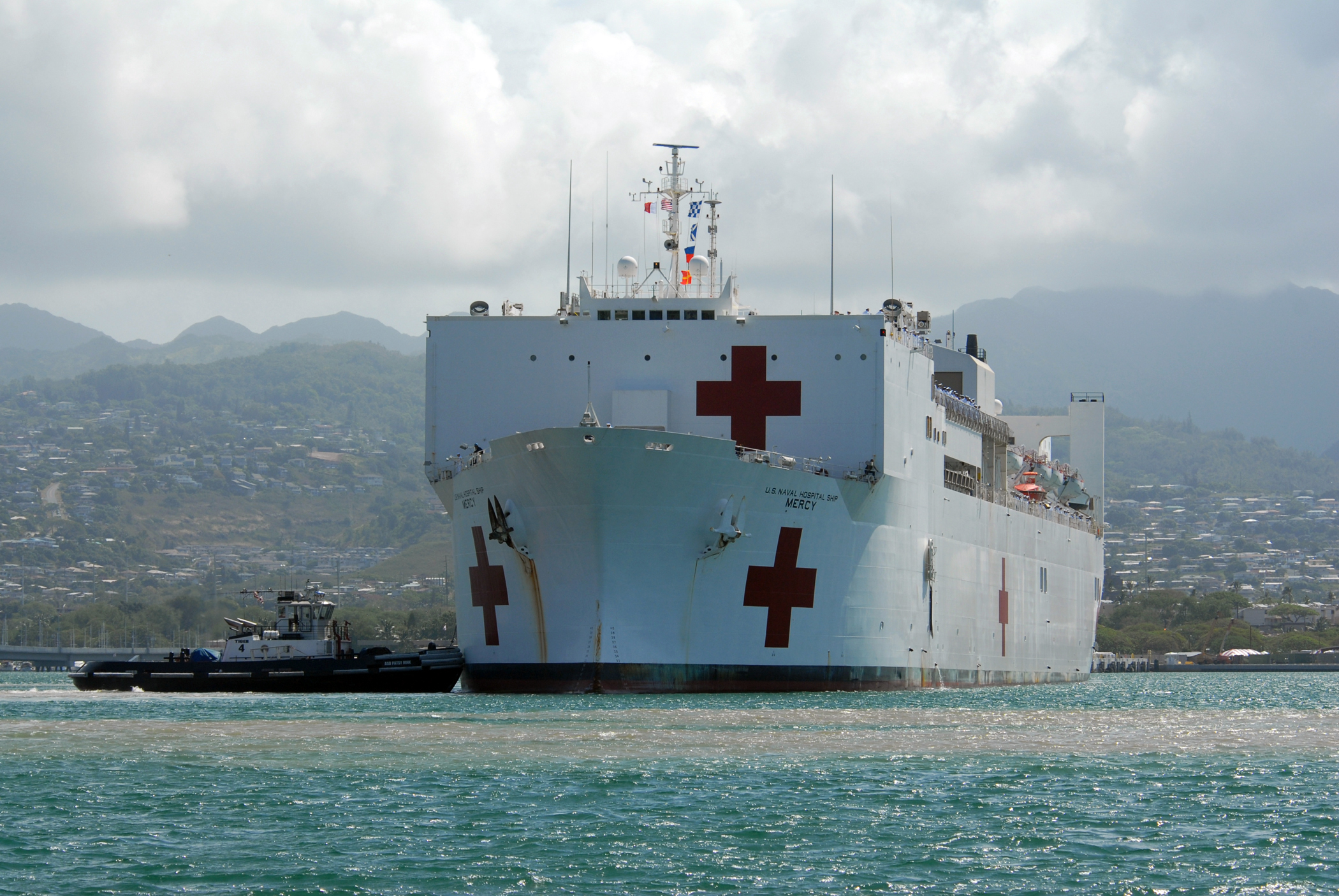 143k | USNS Mercy (T-AH-19), assisted by the Foss Maritime Co., tugboats Alta June, followed by Bo Brusco, and another