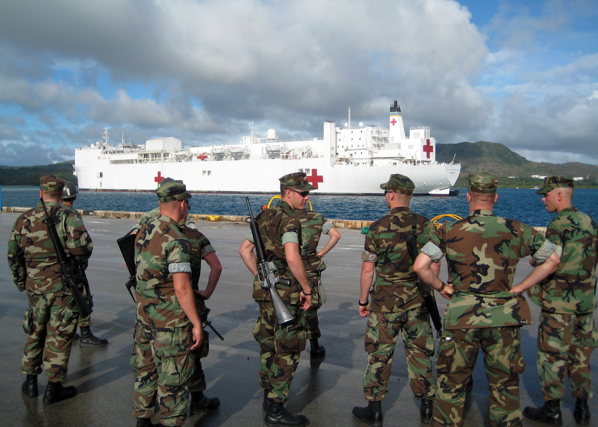 55k | USNS Mercy (T-AH-19) navigates through a rainy morning entering Apra Harbor, Guam, 15 May 2006. Mercy was deploying to the Western Pacific to perform humanitarian assistance and theater security cooperation mission, in an effort to continue to build upon relationships and goodwill established during Operation Unified Assistance in 2005 with partner nations in the region. The ship left its San Diego homeport in April 2006. US Navy photo # 060515-N-4658L-054 by PH2 Mark Allen Leonesio |