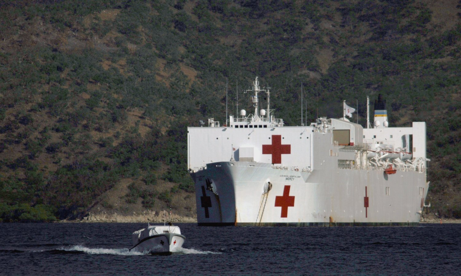 92k | USNS Mercy (T-AH-19) at anchor off the coast of the island of Kupang, West Timor, Indonesia, as Mercy's two transport boats shuttle patients and crew to and from shore, 21 August 2006. Mercy is in the fourth month of a five-month humanitarian and civic assistance deployment to South and Southeast Asia. US Navy photo by PHC Edward G. Martens |
