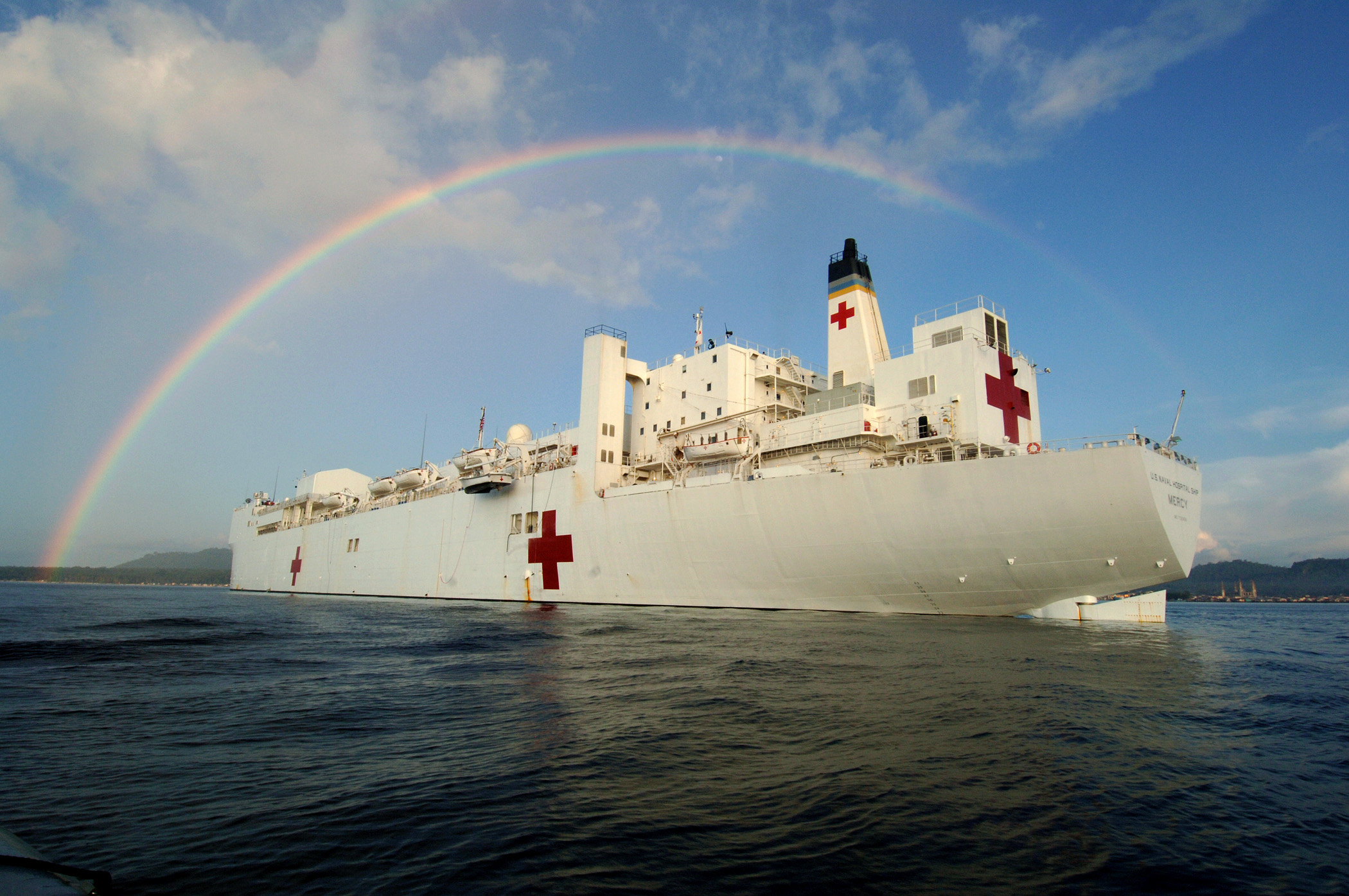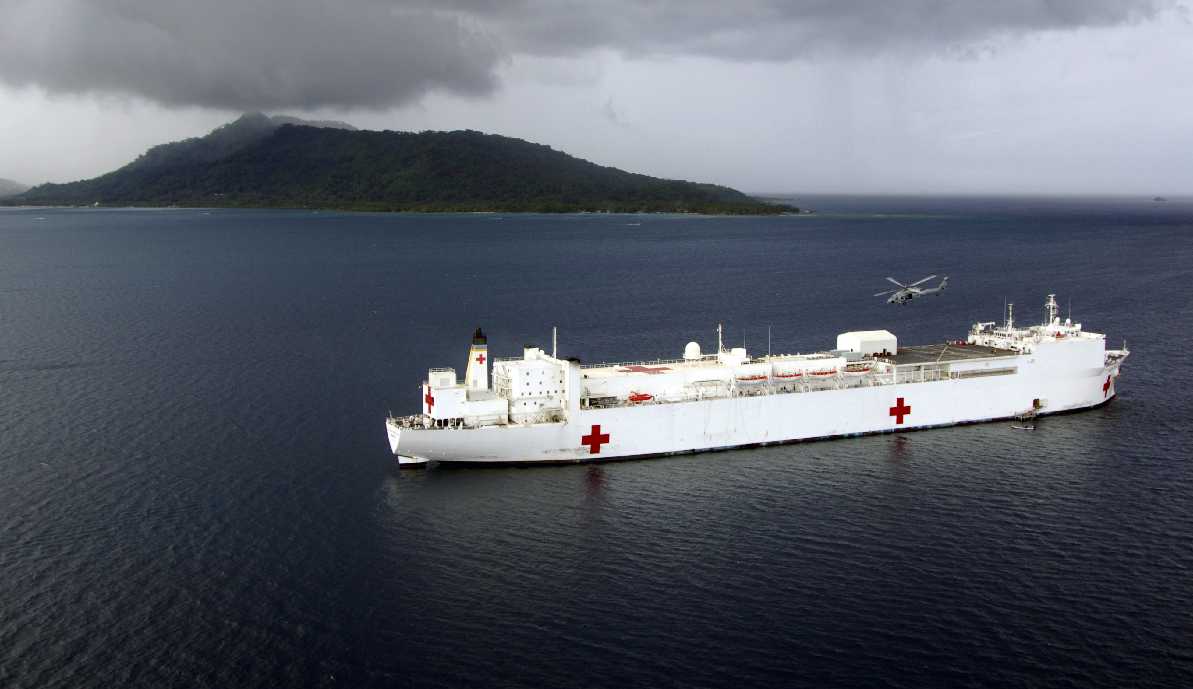 97k | USNS Mercy (T-AH-19) underway off the coast of Nias, Indonesia in the Indian Ocean, 4 April 2005. At the request of the government of Indonesia, Mercy and the USNS Niagara Falls (T-AFS-3) are on station off the coast of Nias, providing assistance as determined appropriate and necessary with earthquake disaster relief efforts and provide medical assistance to those in need. US Navy photo # 050404-N-6665R-174 by PH2 Jeffery Russell. |