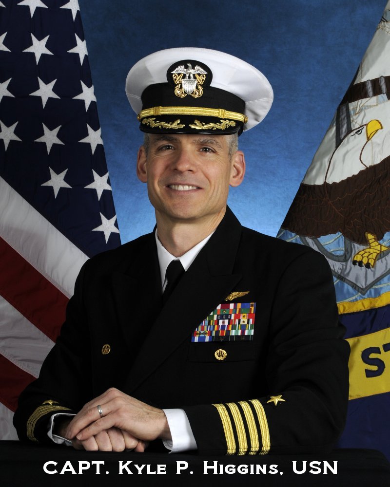 A native of Port Jefferson, NY, Capt. Higgins graduated from the U.S. Merchant Marine Academy in 1990. After serving aboard S.S. Cape Nome during Operation Desert Shield, he was designated a Naval Flight Officer in September 1992. Higgins’ fleet assignments include tours on both coasts. He began as an A-6E Bombardier/Navigator with the “Knightriders” of VA 52 embarked aboard USS Kitty Hawk (CV 63). He then transitioned to the ES-3A and joined the VQ 5 “Sea Shadows” deploying aboard USS Constellation (CV 64). He transitioned again in September 2000 to the EA-6B Prowler and joined the “Zappers” of VAQ 130, flying combat missions during Operation Iraqi Freedom aboard USS Harry S. Truman (CVN 75). He served as Commanding Officer of the “Yellow Jackets” of VAQ 138 and as Executive Officer of USS John C. Stennis (CVN 74).
